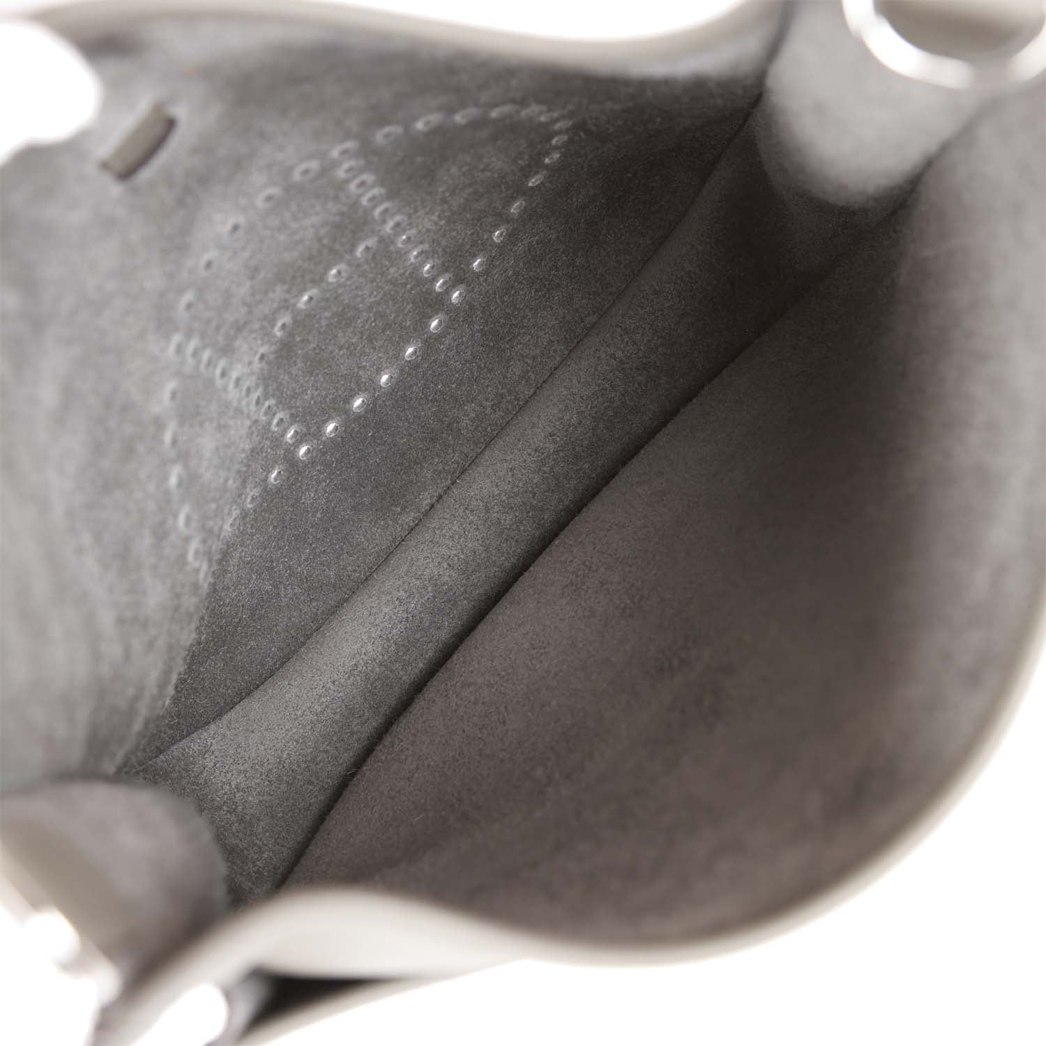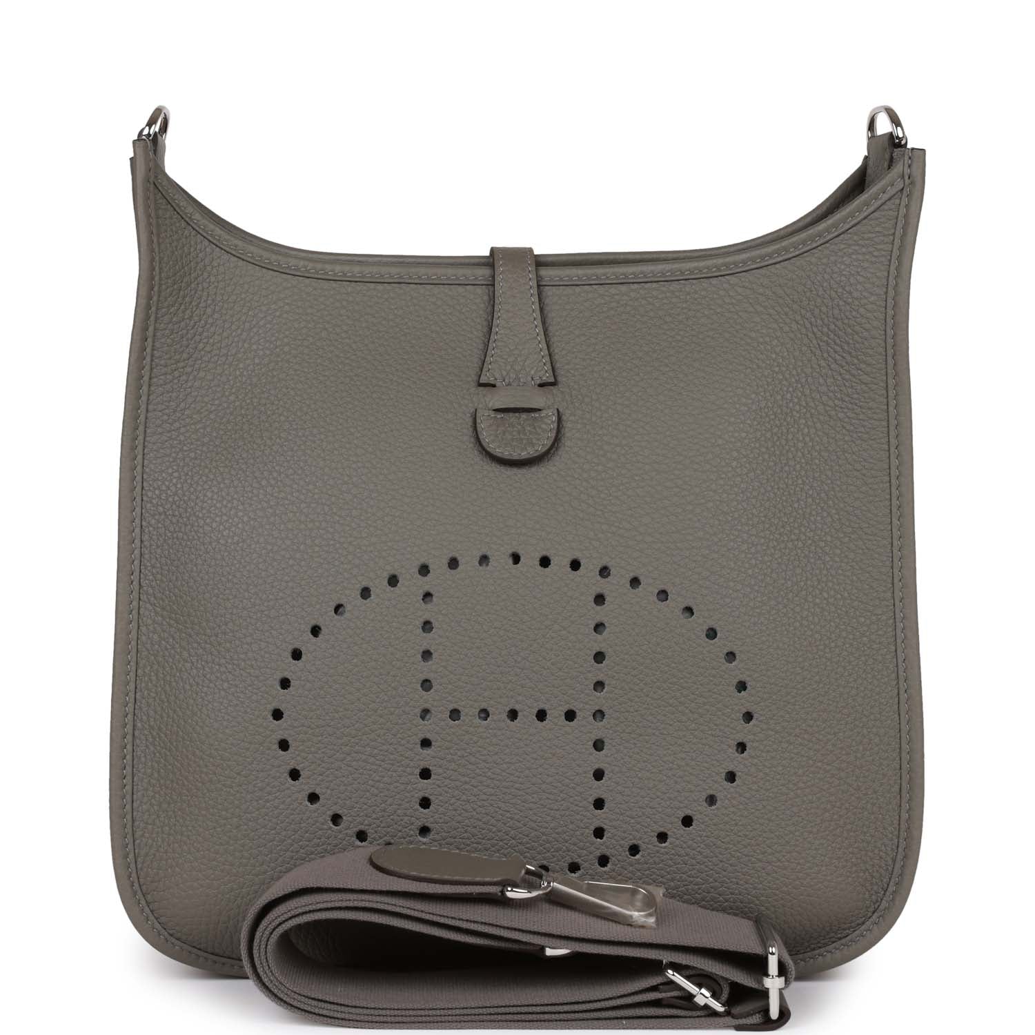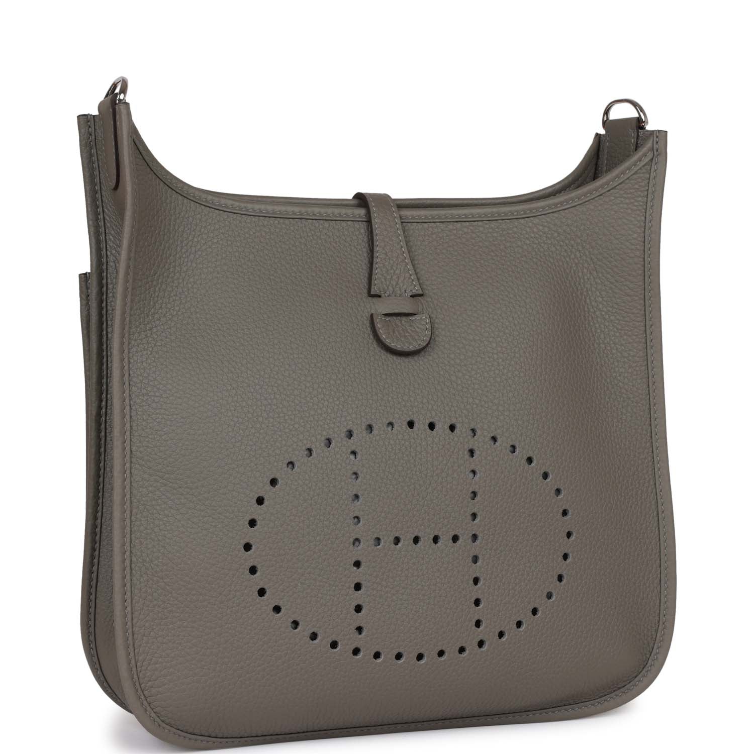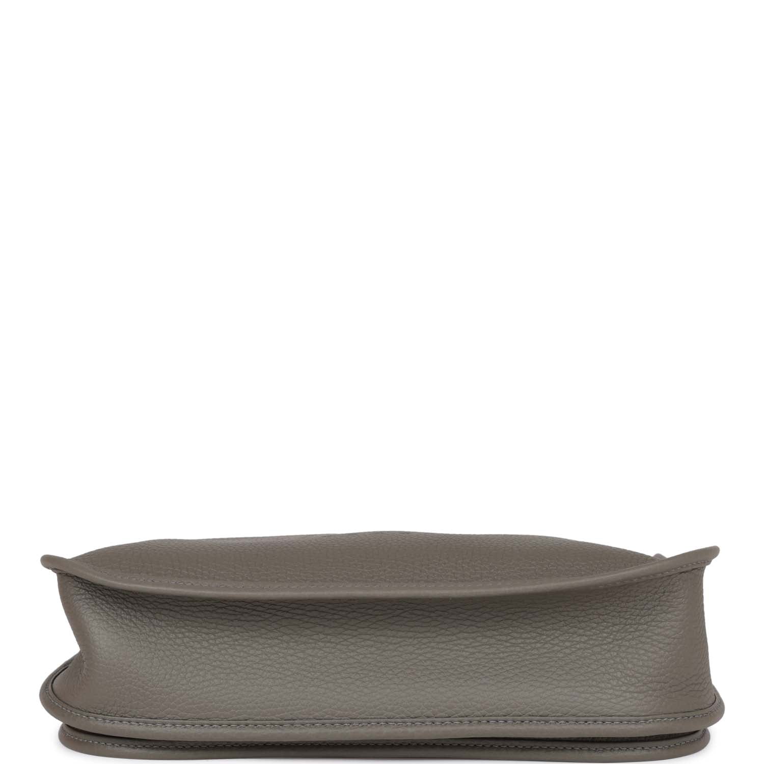 This Evelyne is in Gris Meyer clemence leather with palladium hardware and has tonal stitching, pull tab top closure and Gris Meyer removable canvas and leather shoulder/crossbody strap.