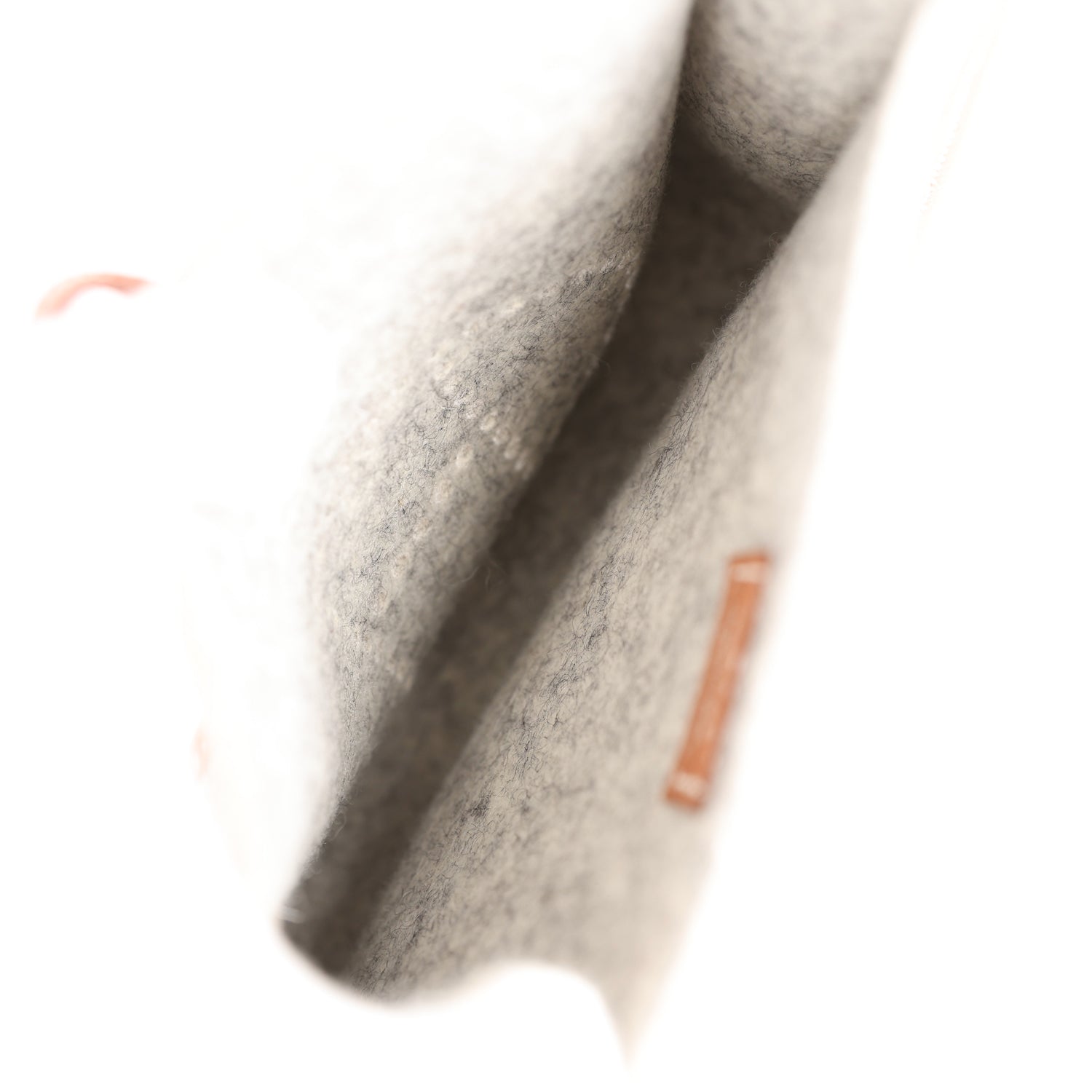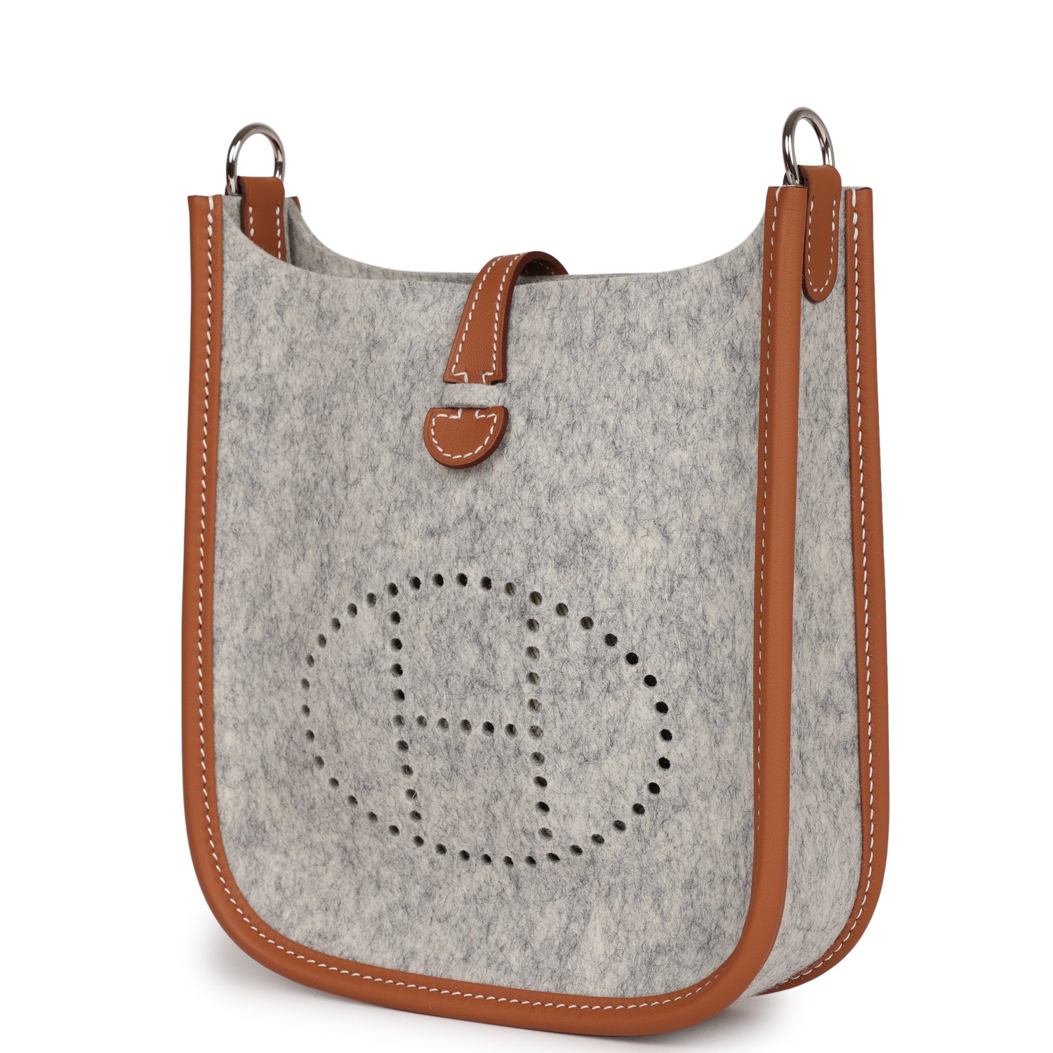 This Evelyne TPM is in Gris Clair wooly felt and Gold swift leather with palladium hardware and features contrast stitching stitching, pull tab top closure and a gold removable canvas and leather shoulder/crossbody strap.