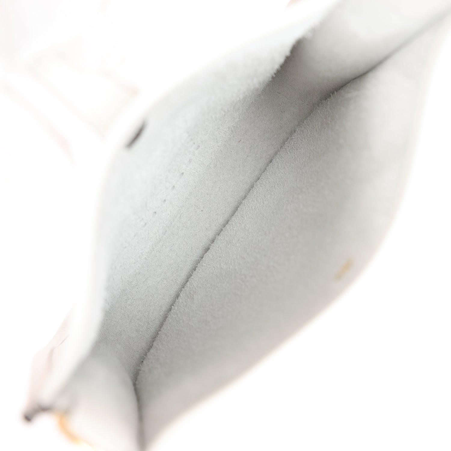 This Evelyne TPM is in New White clemence leather with gold hardware and features tonal stitching stitching, pull tab top closure and a white removable canvas and leather shoulder/crossbody strap.