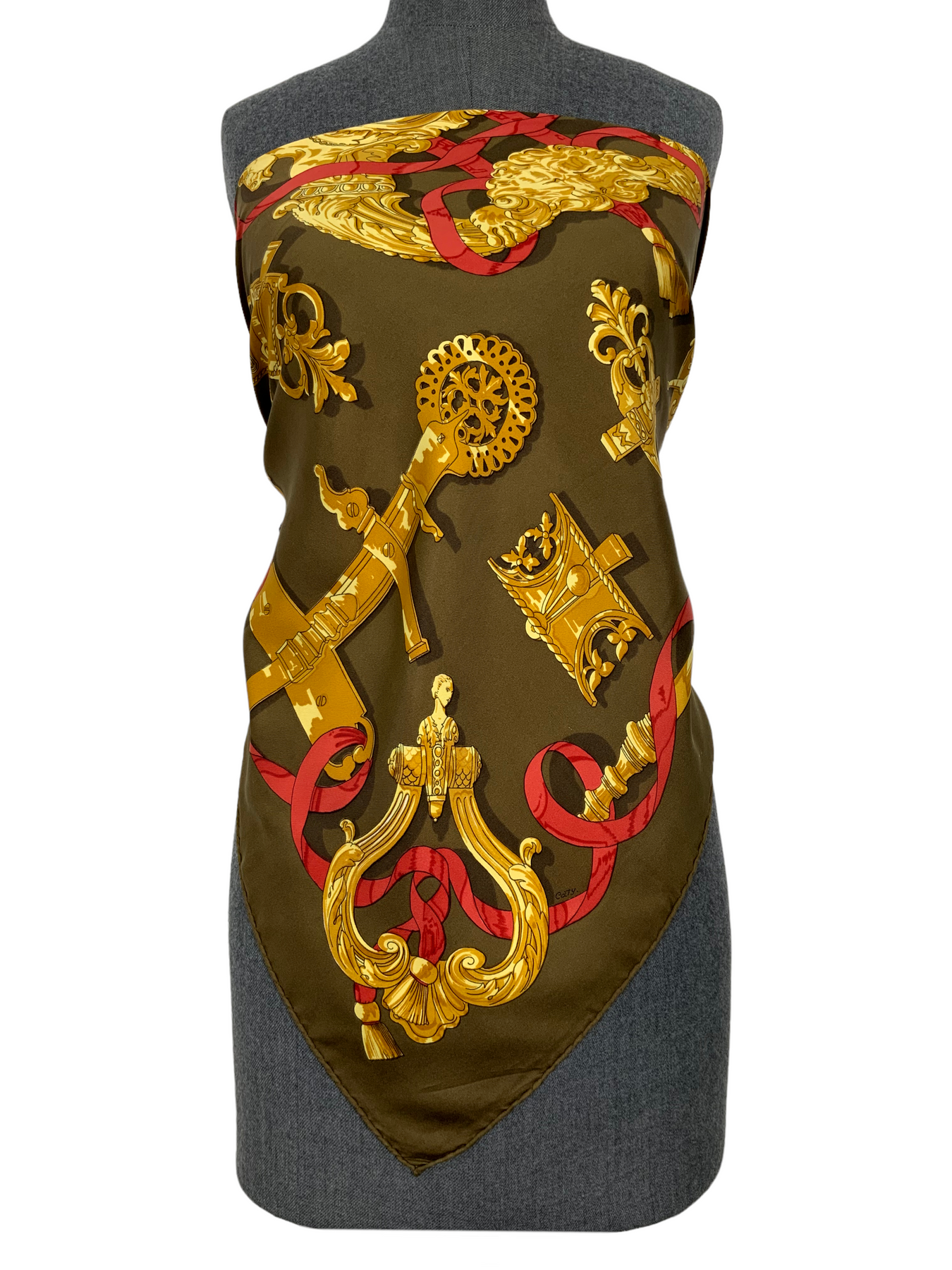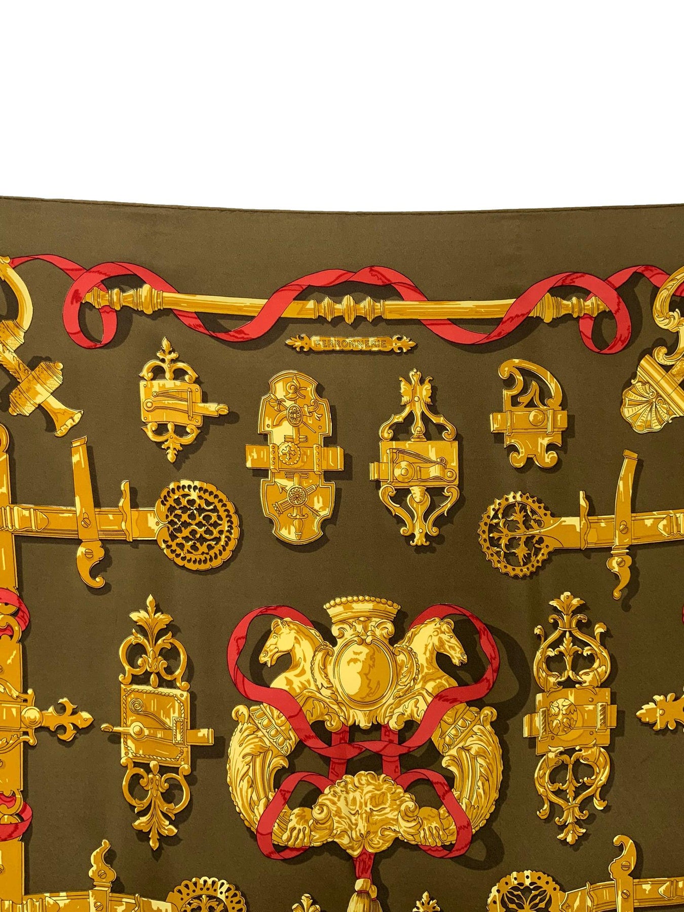 We the ity of this Hermes Ferronnerie Silk Scarf 90 designed by Joachim Metz was first issued in 1970. The stunning scarf features olive green, gold and red hues with hand-rolled edges.