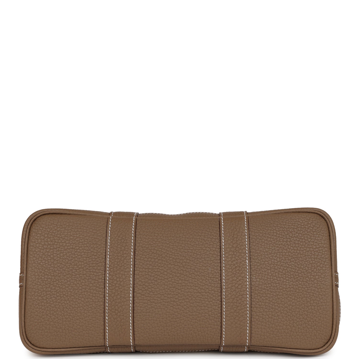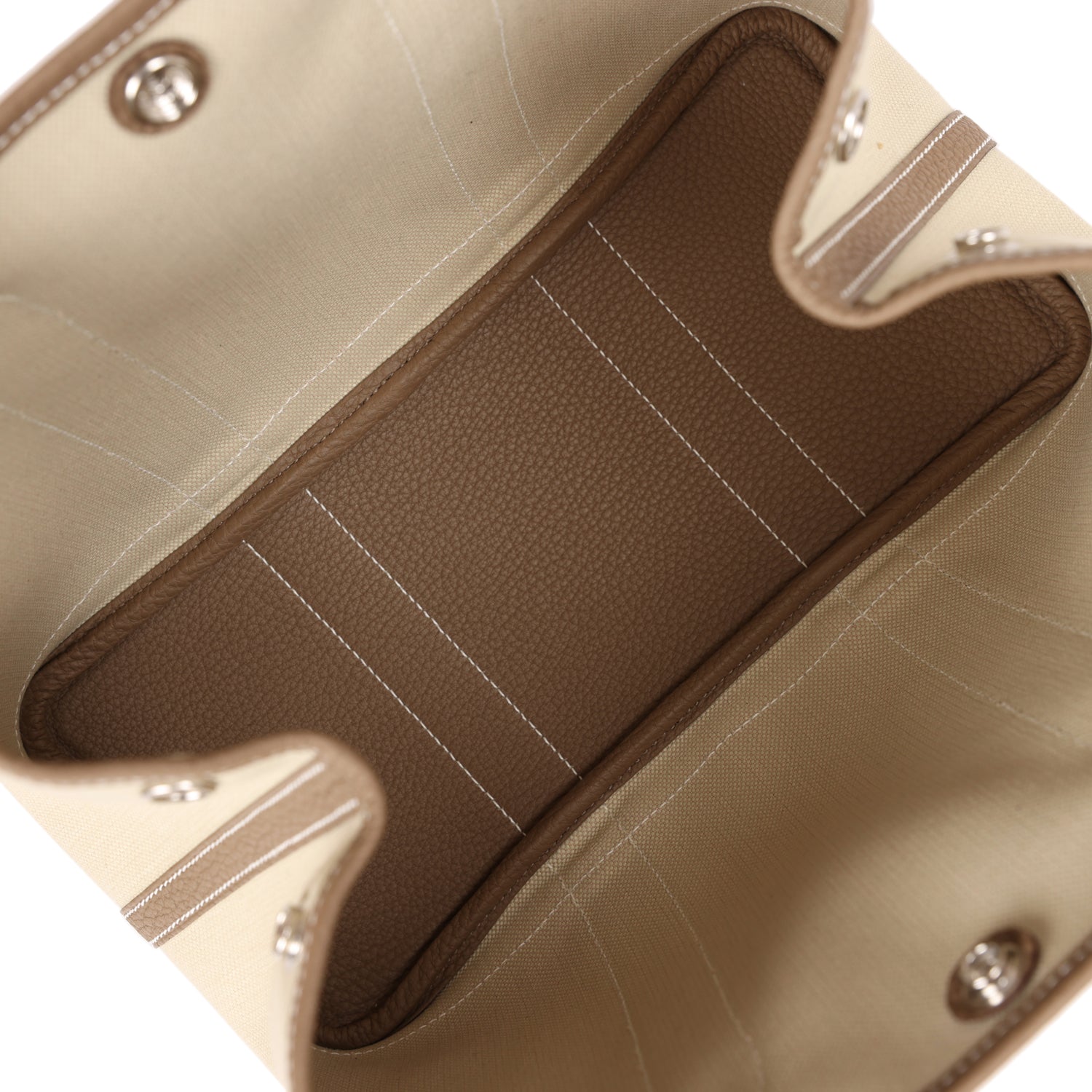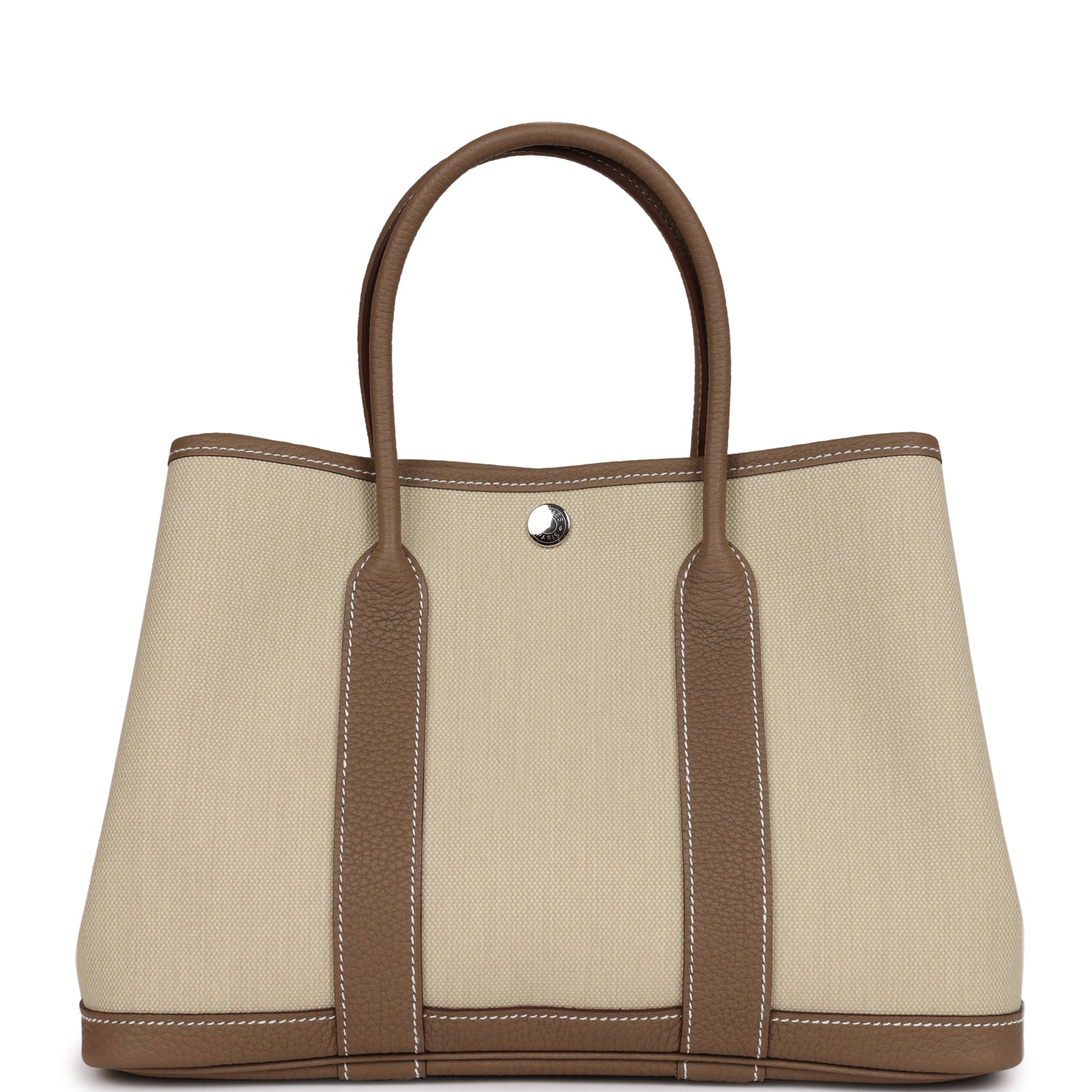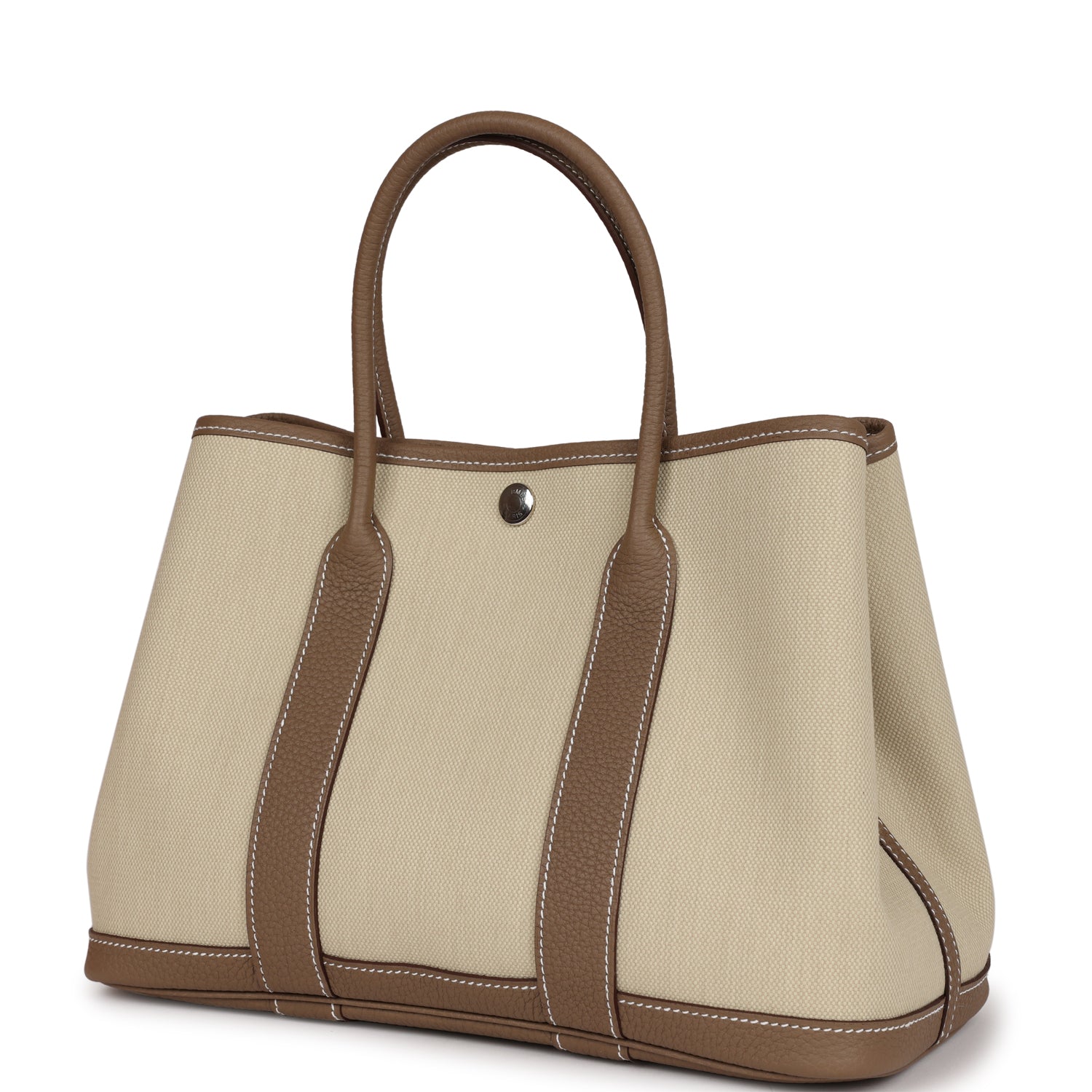 This Garden Party 30 is in Etoupe and Beton Toile and Negonda with Palladium Hardware, contrast stitching, one engraved palladium front snap closure with two snap clousres on the side to adjust bag width. This bag features two top handles
