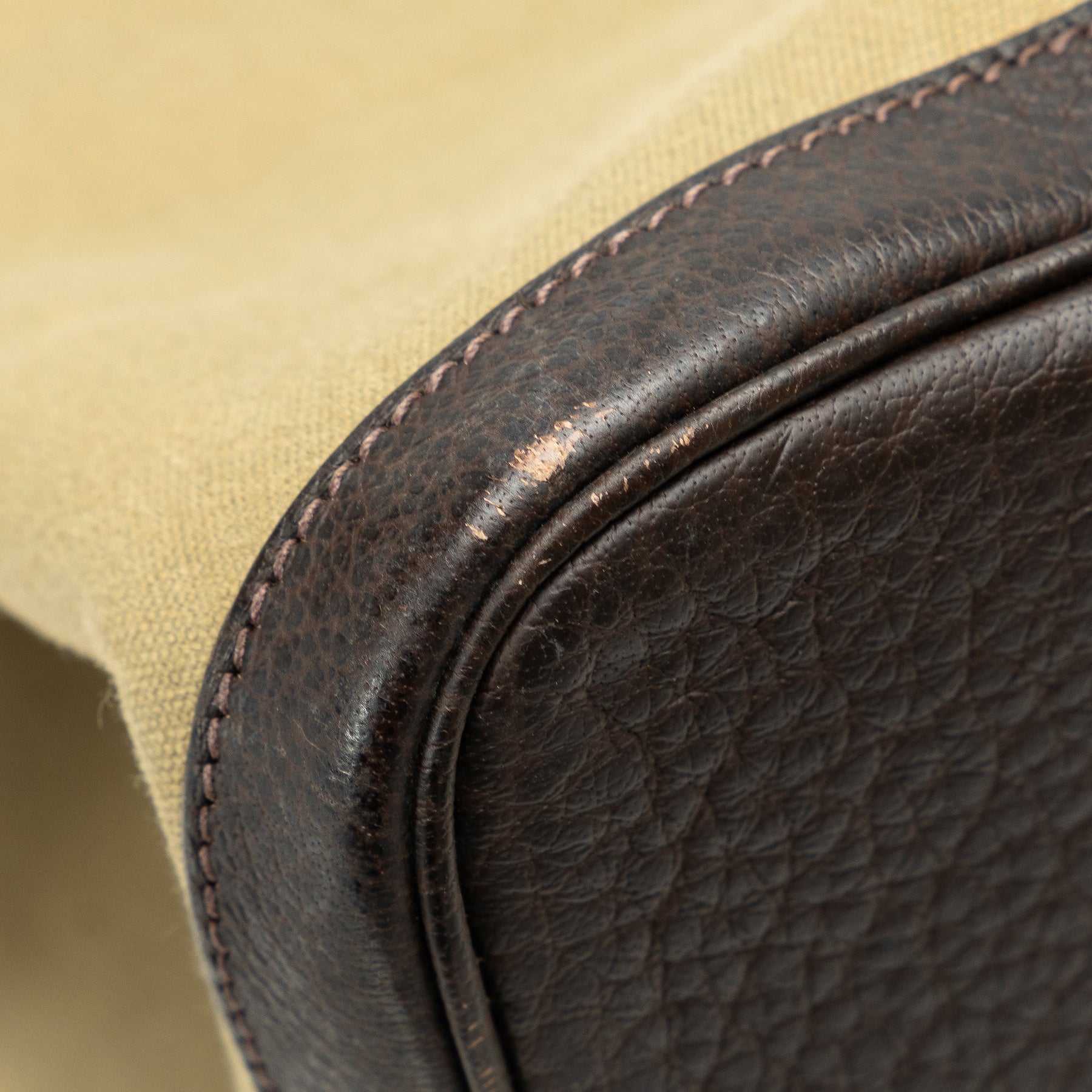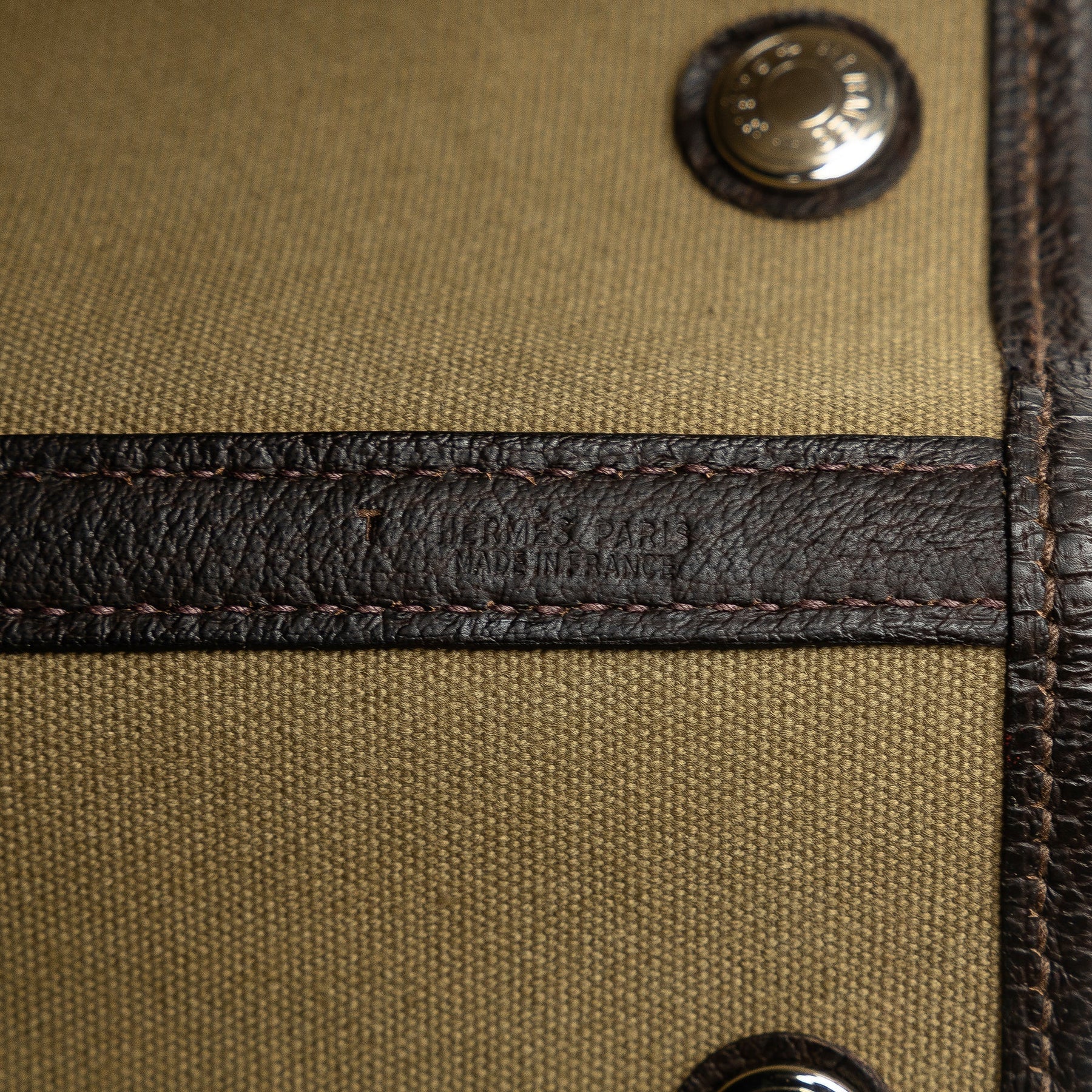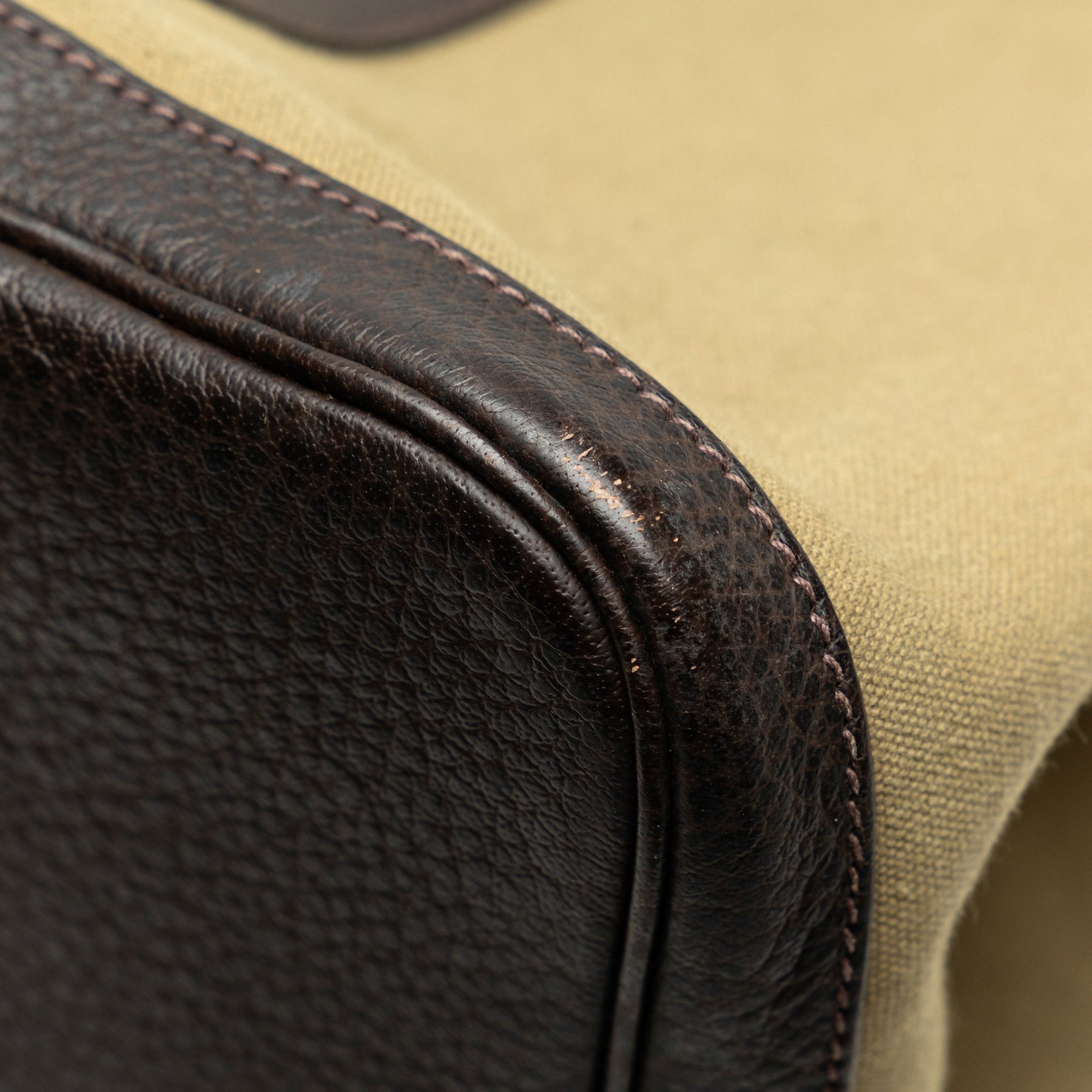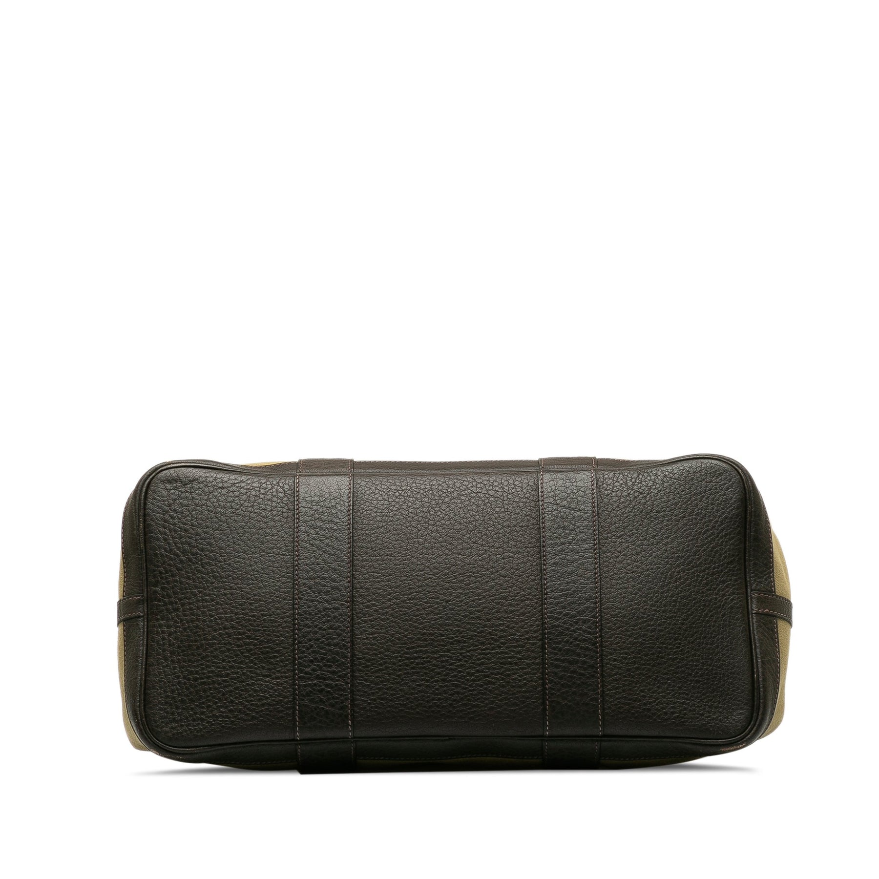 The Garden Party PM features a canvas body with textured leather details, rolled handles, and a top clasp closure.