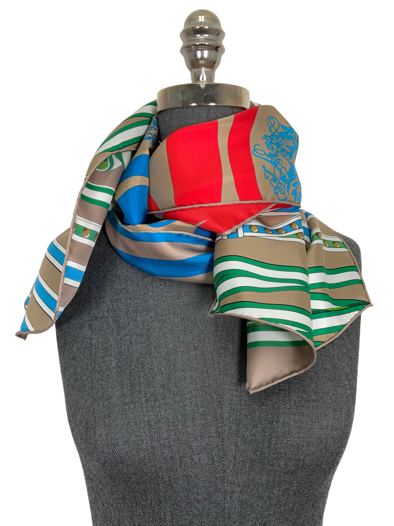 We the ity of this never before chic HERMES Grand Tralala Silk Muffler Scarf designed by Virginie Jamin and beautifully crafted in elegant light brown, red, green and blue soft silk.