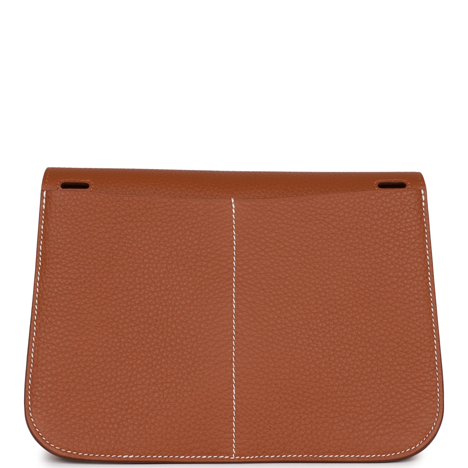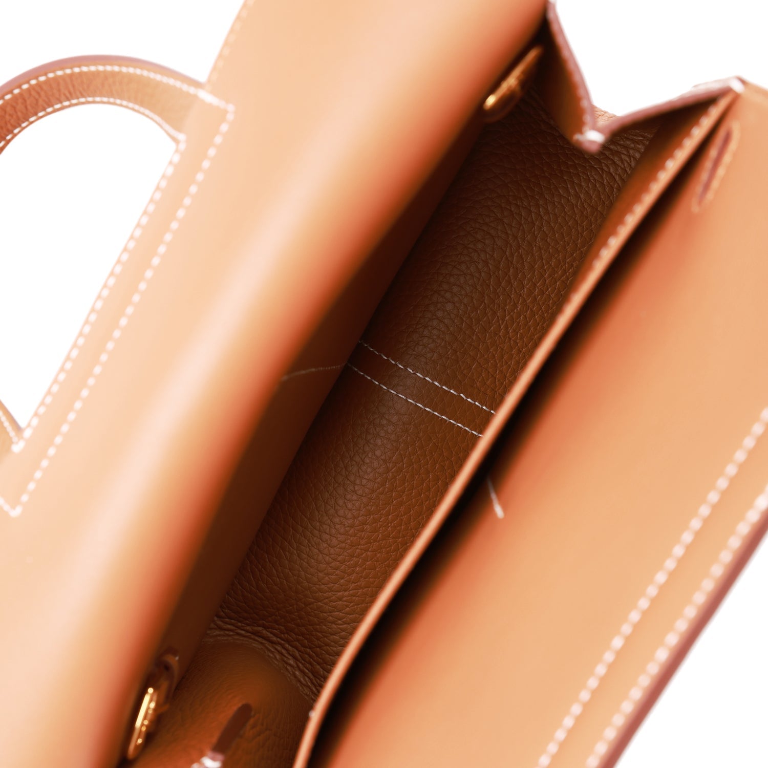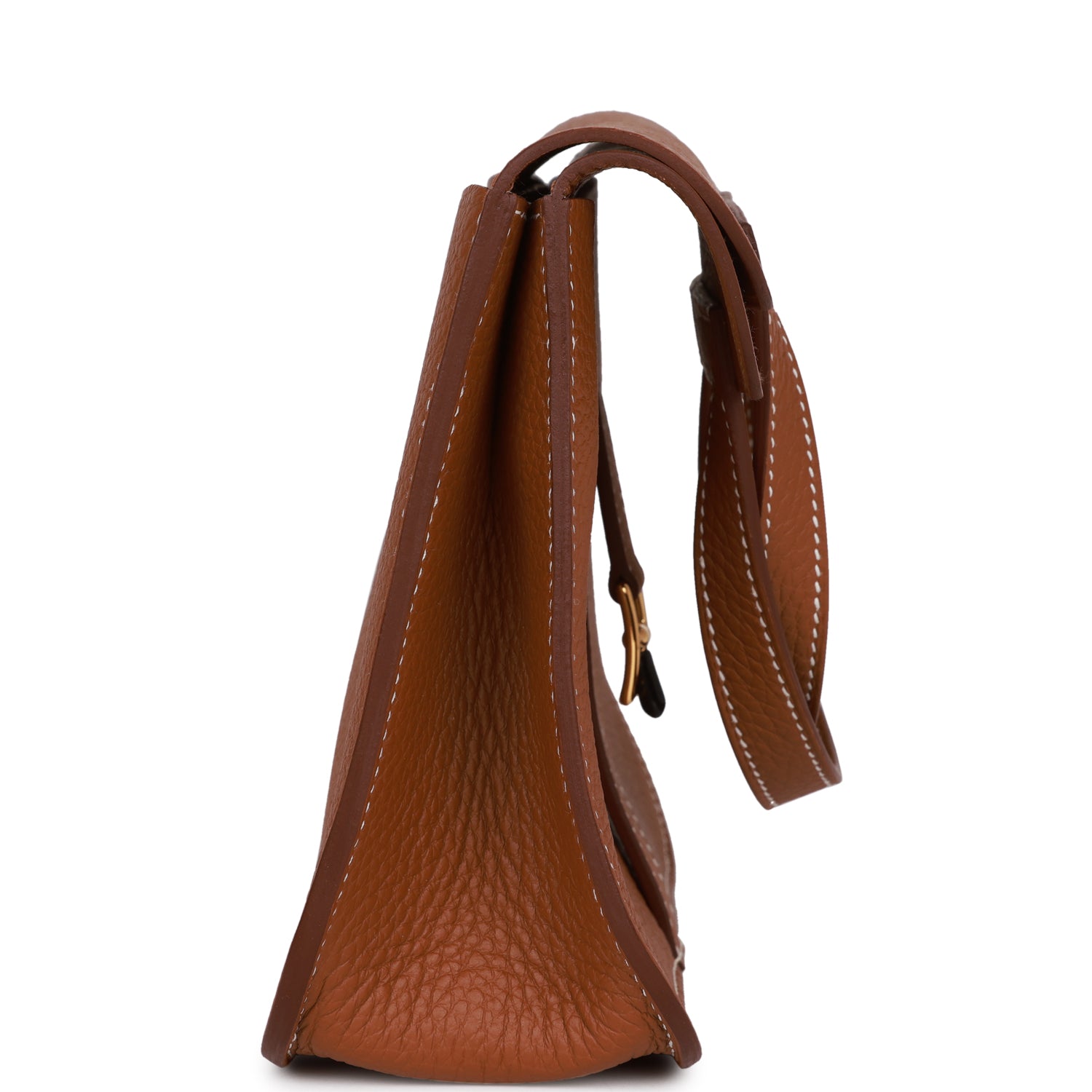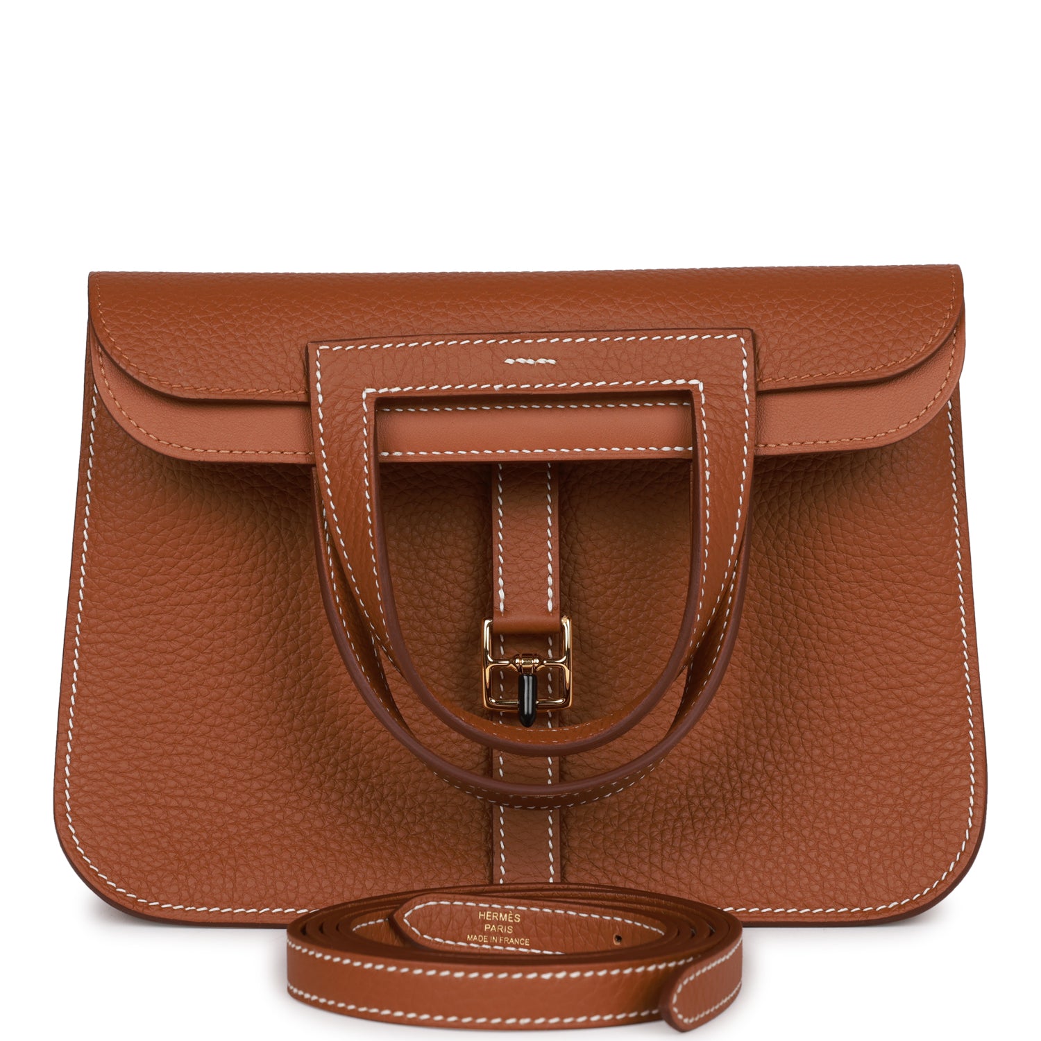 This Halzan 25, is in gold clemence leather with gold hardware and has tonal stitching, front loop closure, foldable top handles, and a long crossbody strap for multistyle wear.
