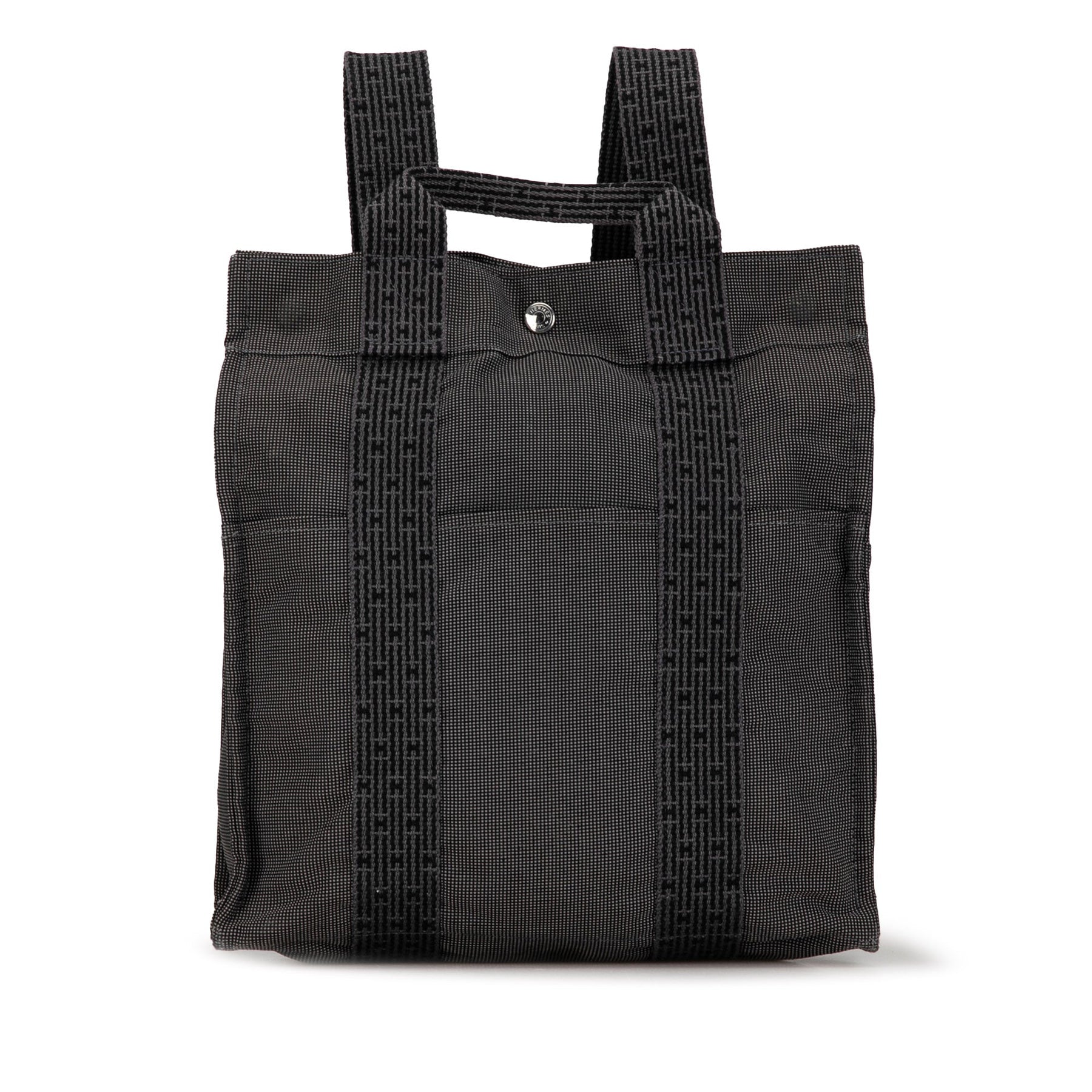 This backpack features a canvas body, flat back straps, a flat top handle, an open top with snap button closure, and an interior slip pocket.