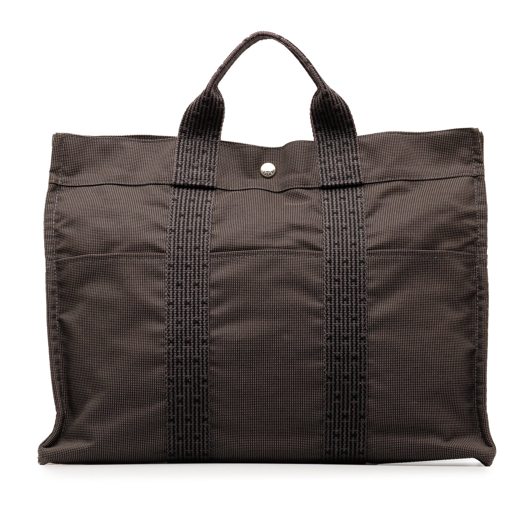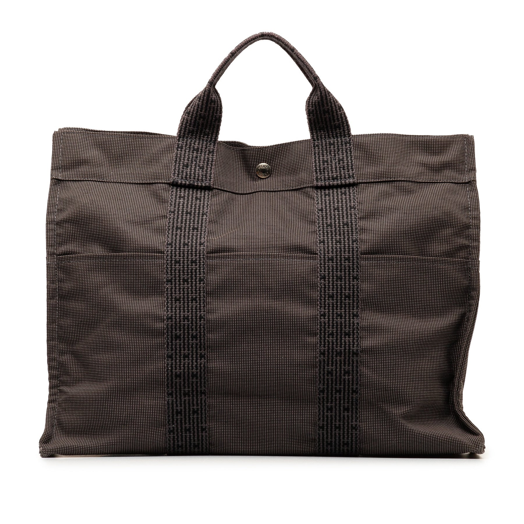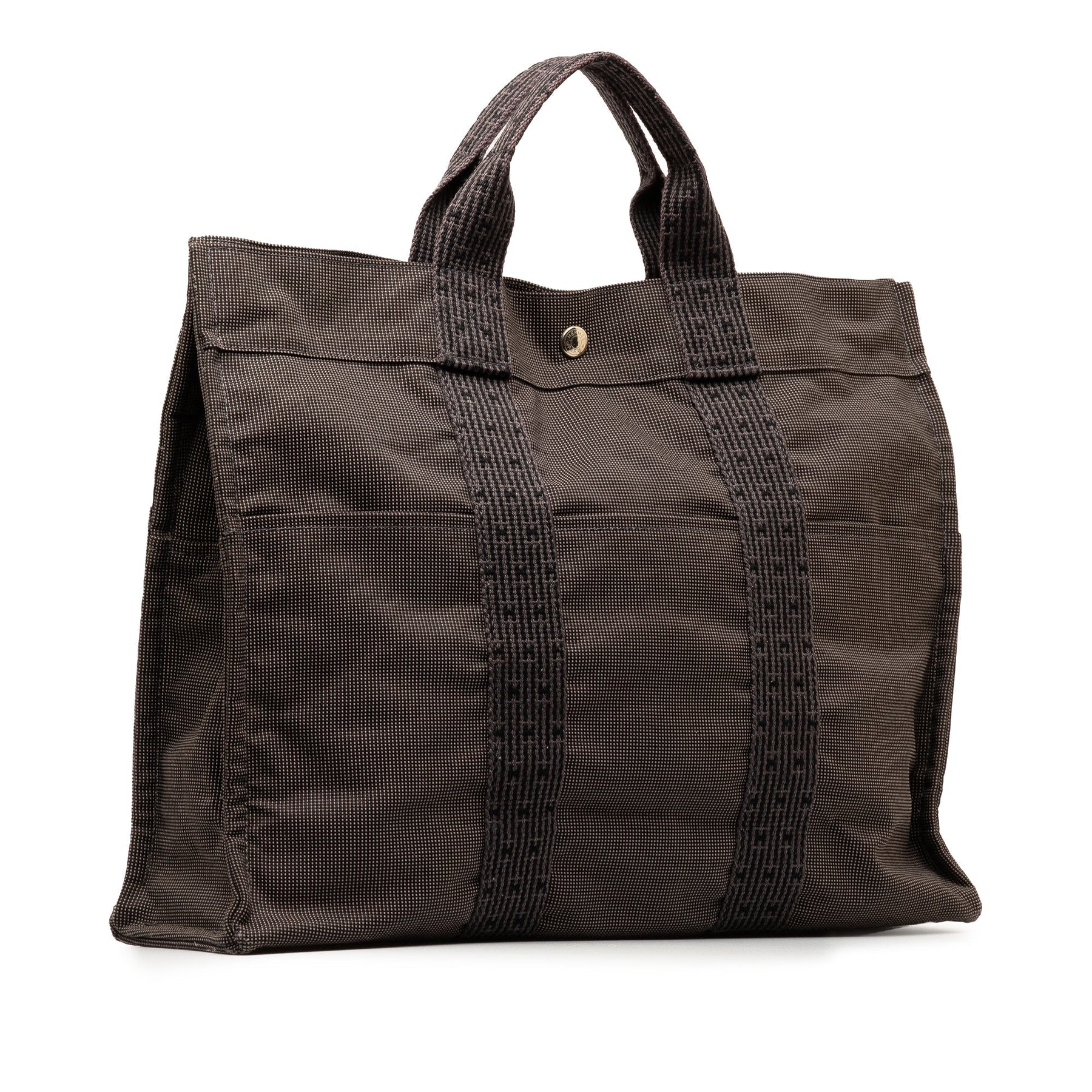 The Herline MM tote bag features a canvas body, exterior front and back slip pockets, flat handles, a top zip closure, and an interior slip pocket.