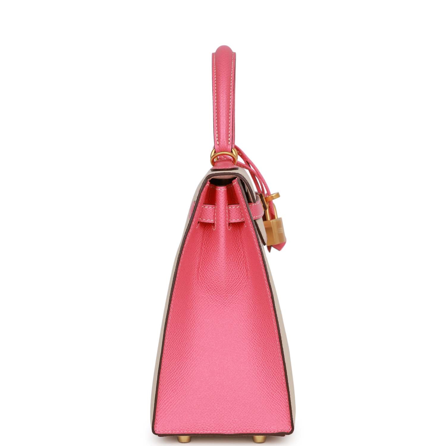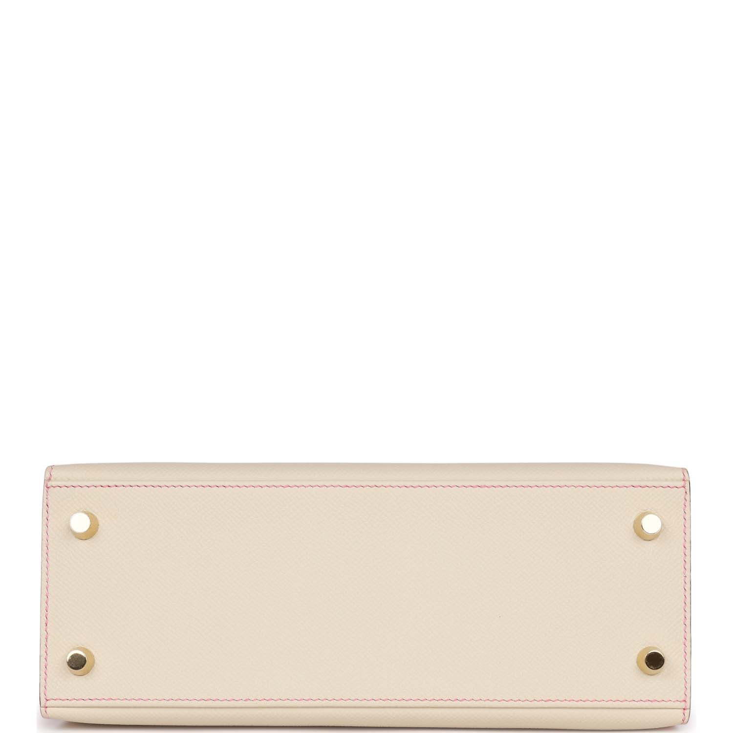 This Special Order (HSS) Kelly 25cm, in the Sellier style, is in Craie and Rose Lipstick epsom leather with brushed gold hardware and has tonal stitching, front flap, two straps with center toggle closure, clochette with lock and two keys a single rolled handle and removable shoulder strap.