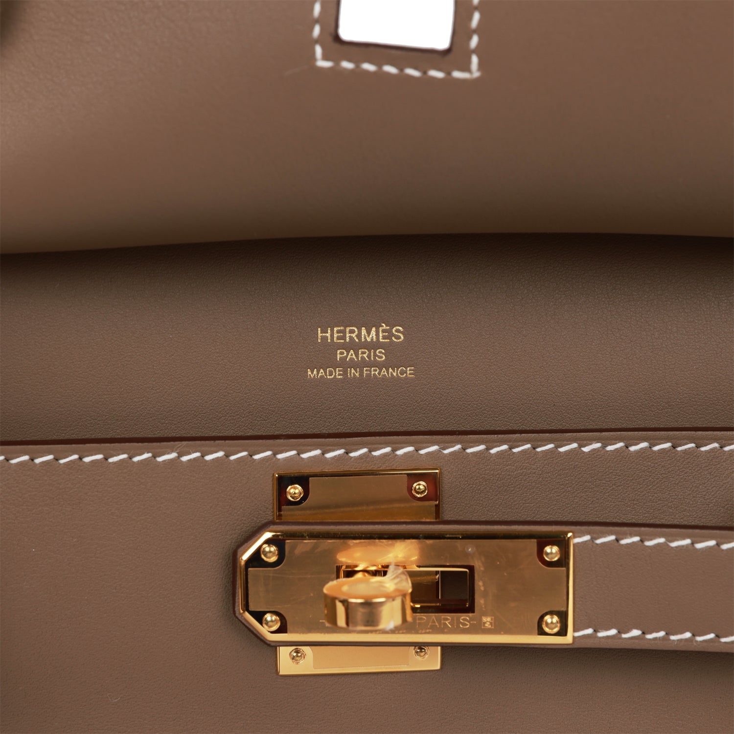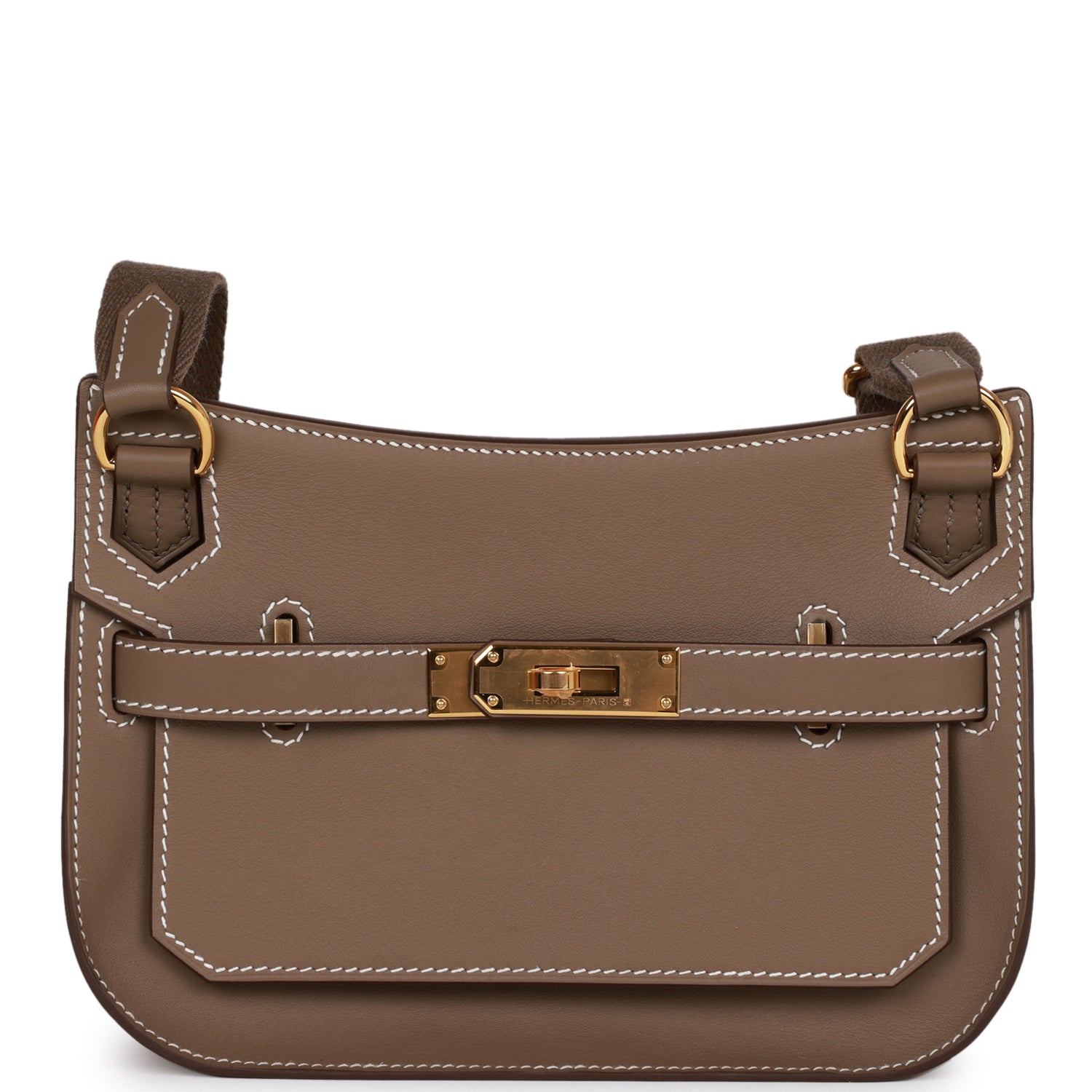 This Jypsiere mini is in Etoupe swift leather with gold hardware and has contrast stitching, a single flap, two pull straps, turnlock closure, and an adjustable wooly shoulder strap.