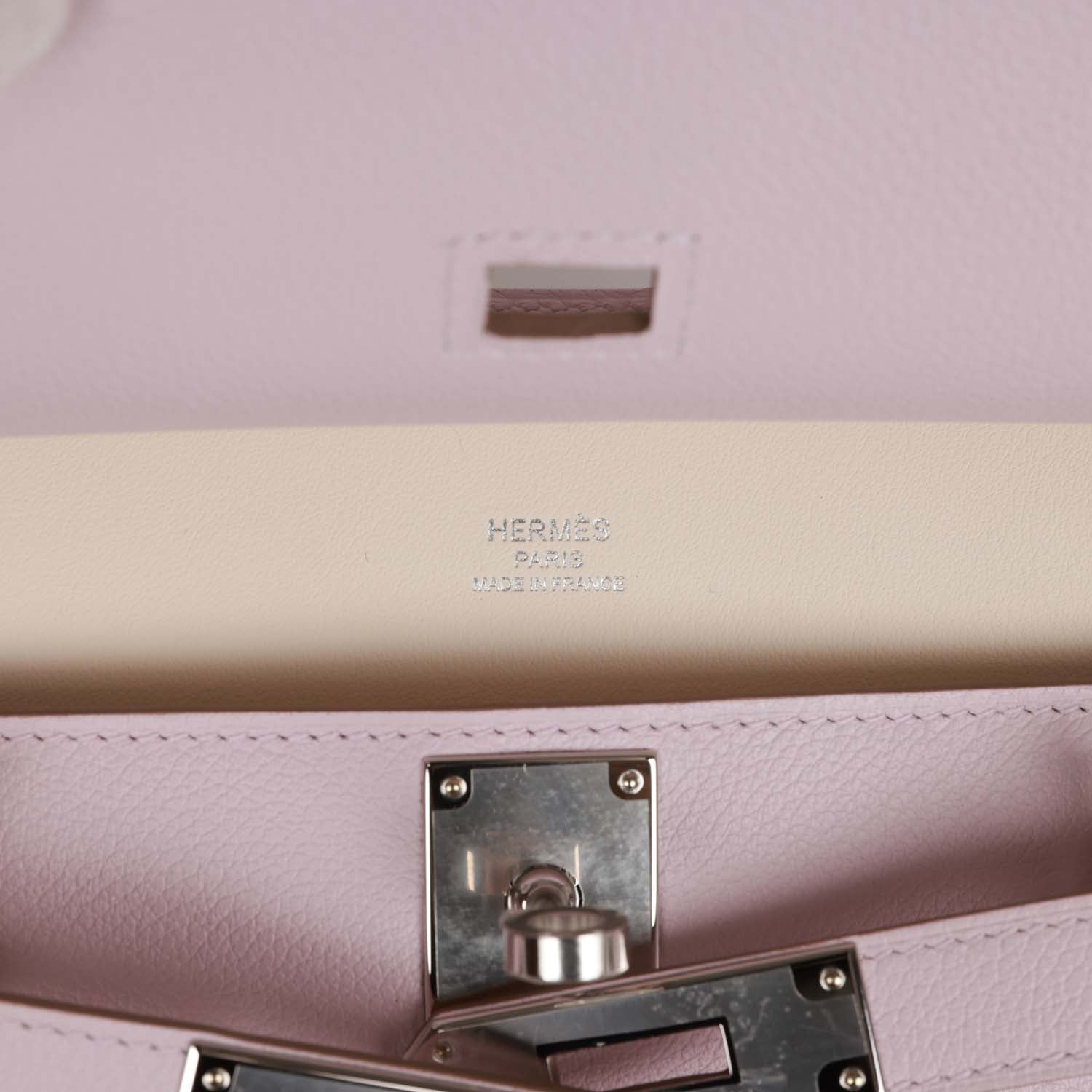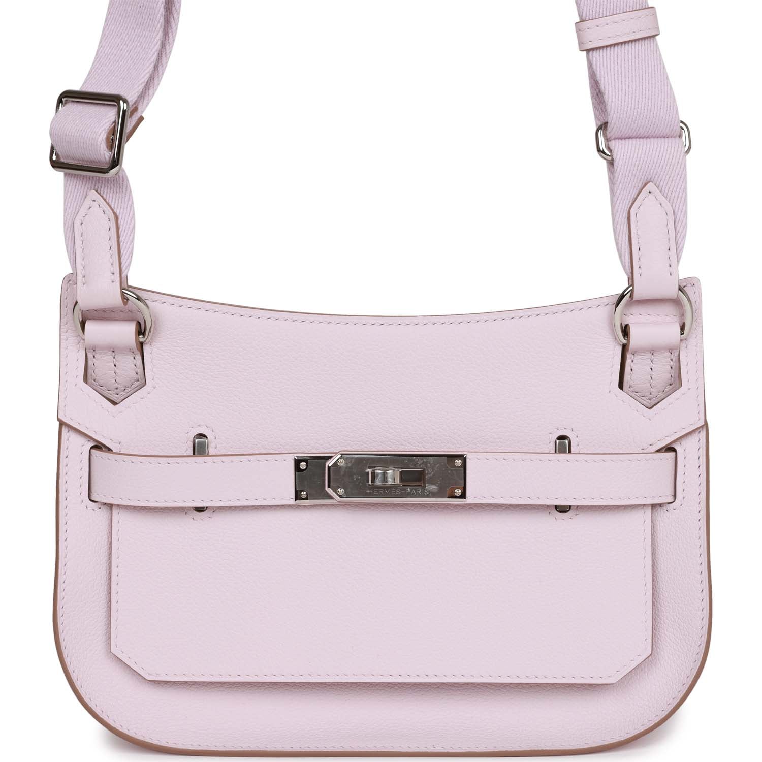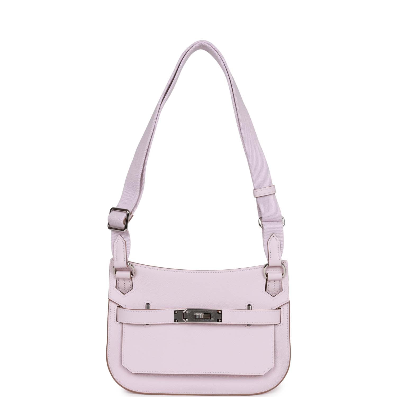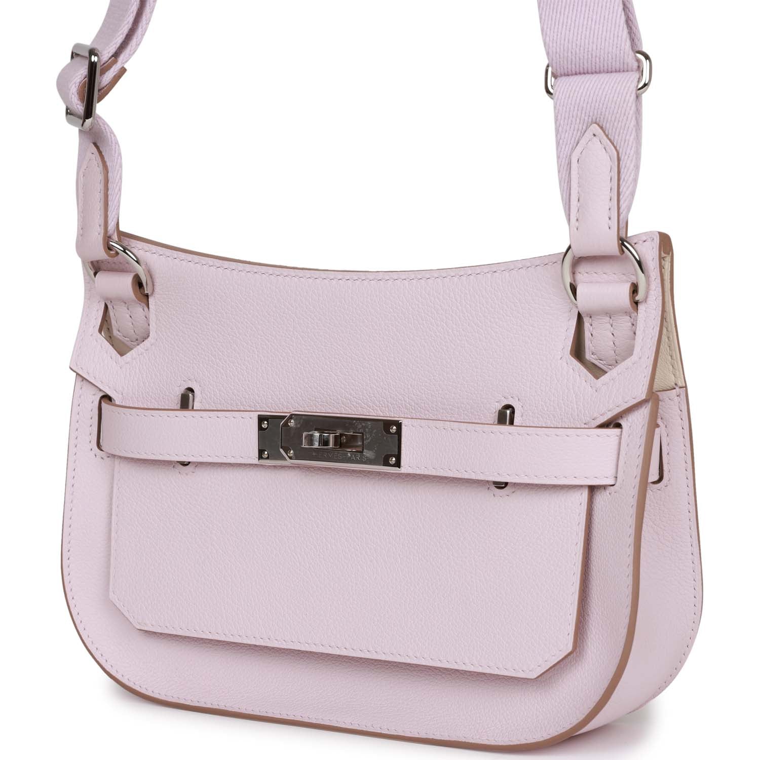 This Jypsiere mini is in mauve pale evercolor leather with palladium hardware, has tonal stitching, a single flap, two pull straps, turnlock closure, and adjustable wool shoulder strap.