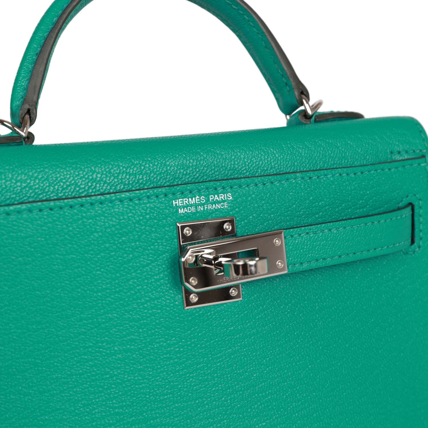 This Kelly, is in Vert Verone chevre leather with palladium hardware, has tonal stitching, two front straps with front toggle closure, single rolled handle and removable shoulder strap.