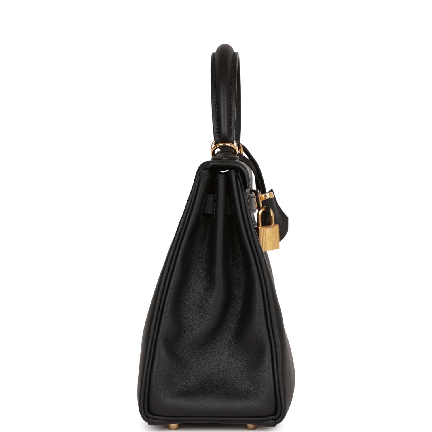 This Kelly 25 is of black swift leather with gold hardware and has tonal stitching, front flap, two straps with center toggle closure, clochette with lock and two keys, single rolled handle and an optional shoulder strap.