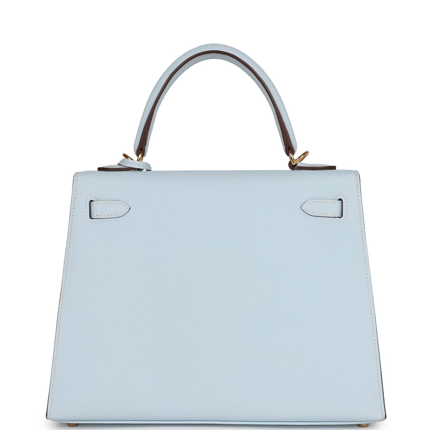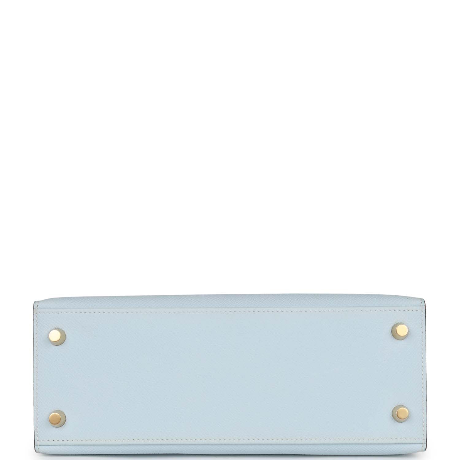 This Kelly, in the Sellier style, is in Bleu Brume epsom leather with gold hardware and has tonal stitching, front flap, two straps with center toggle closure, clochette with lock and two keys a single rolled handle and removable shoulder strap.