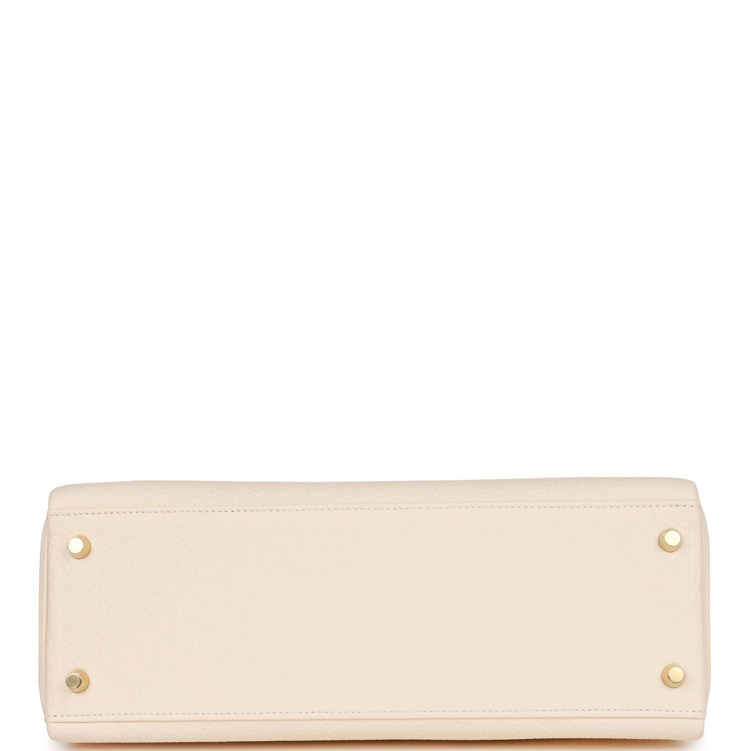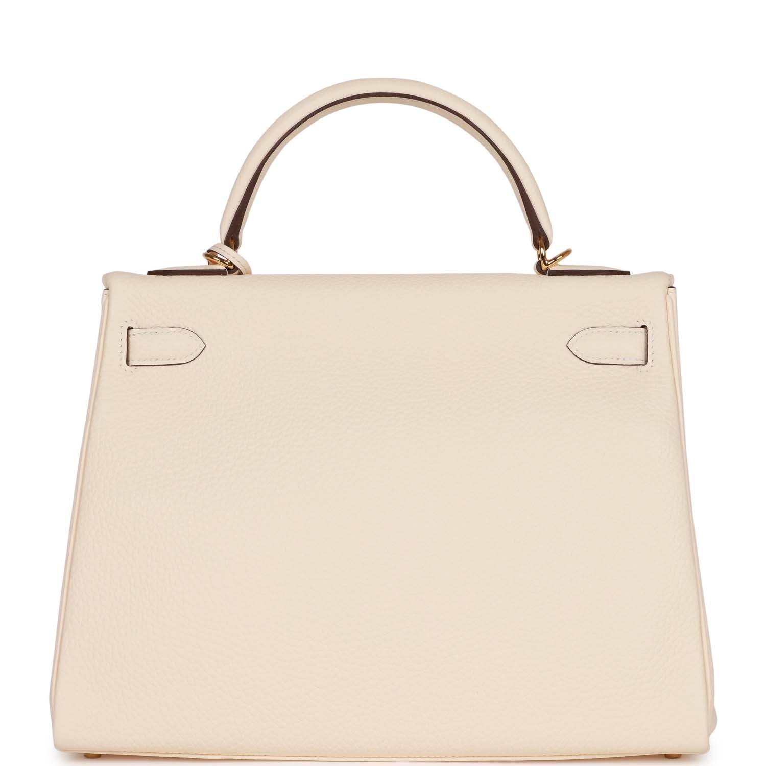 This Hermes Kelly 32, is in Nata clemence leather with gold hardware, tonal stitching, front toggle closure, clochette with lock and two keys, single rolled handle and removable strap