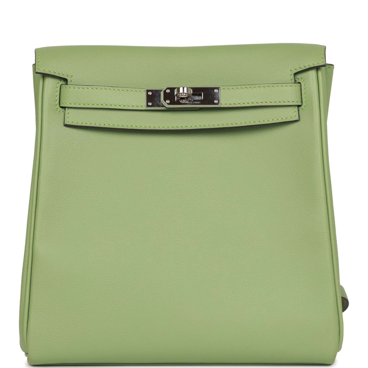 This Kelly Ado Backpack is in Vert Criquet Evercolor leather with palladium hardware and has tonal stitching, two straps with front toggle closure, and two adjustable shoulder straps.
