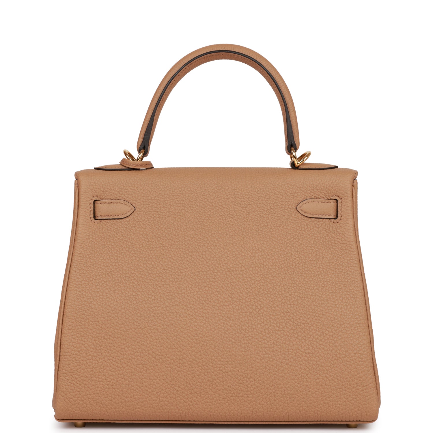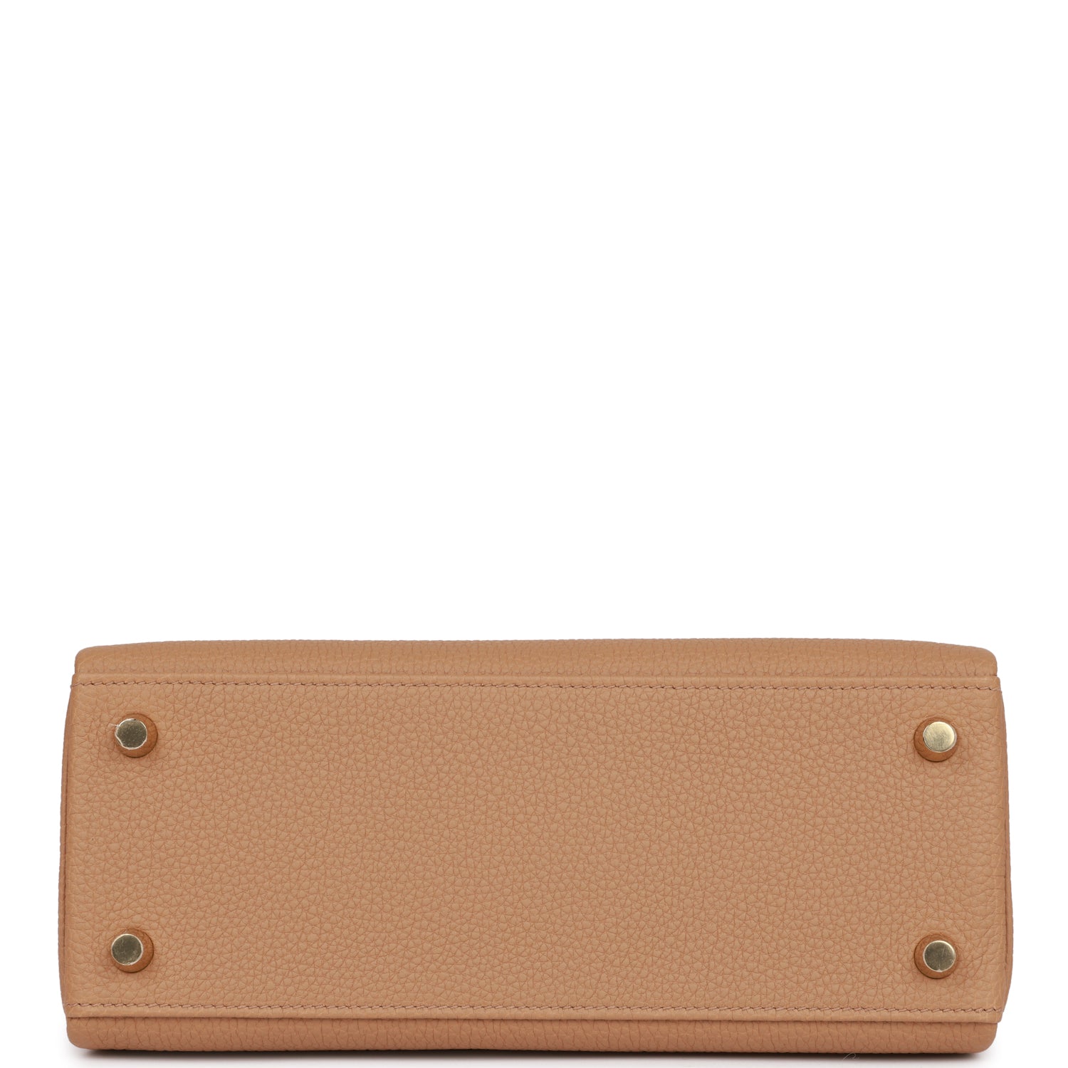 This Retourne Kelly is of Chai togo leather with gold hardware and has tonal stitching, front flap, two straps with center toggle closure, clochette with lock and two keys, single rolled handle and an optional shoulder strap.