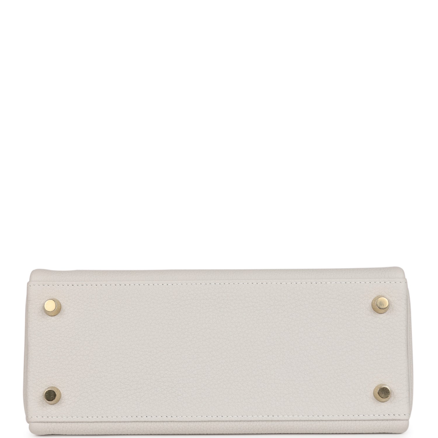 This Kelly, in the Retourne style, is in Gris Pale togo leather with gold hardware and has tonal stitching, two straps with front toggle closure, clochette with lock and two keys, single rolled handle and removable shoulder strap.