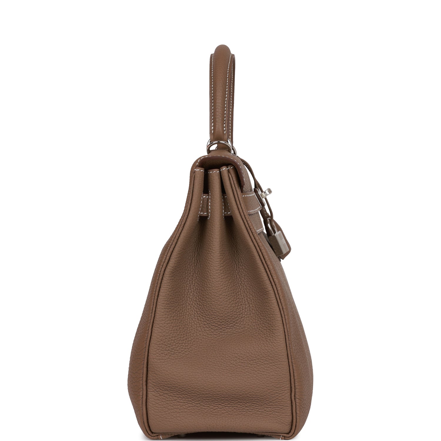 This Kelly, in the Retourne style, is in Etoupe togo leather with palladium hardware and has contrast stitching, front flap, two straps with center toggle closure, clochette with lock and two keys, single rolled handle and removable shoulder strap.