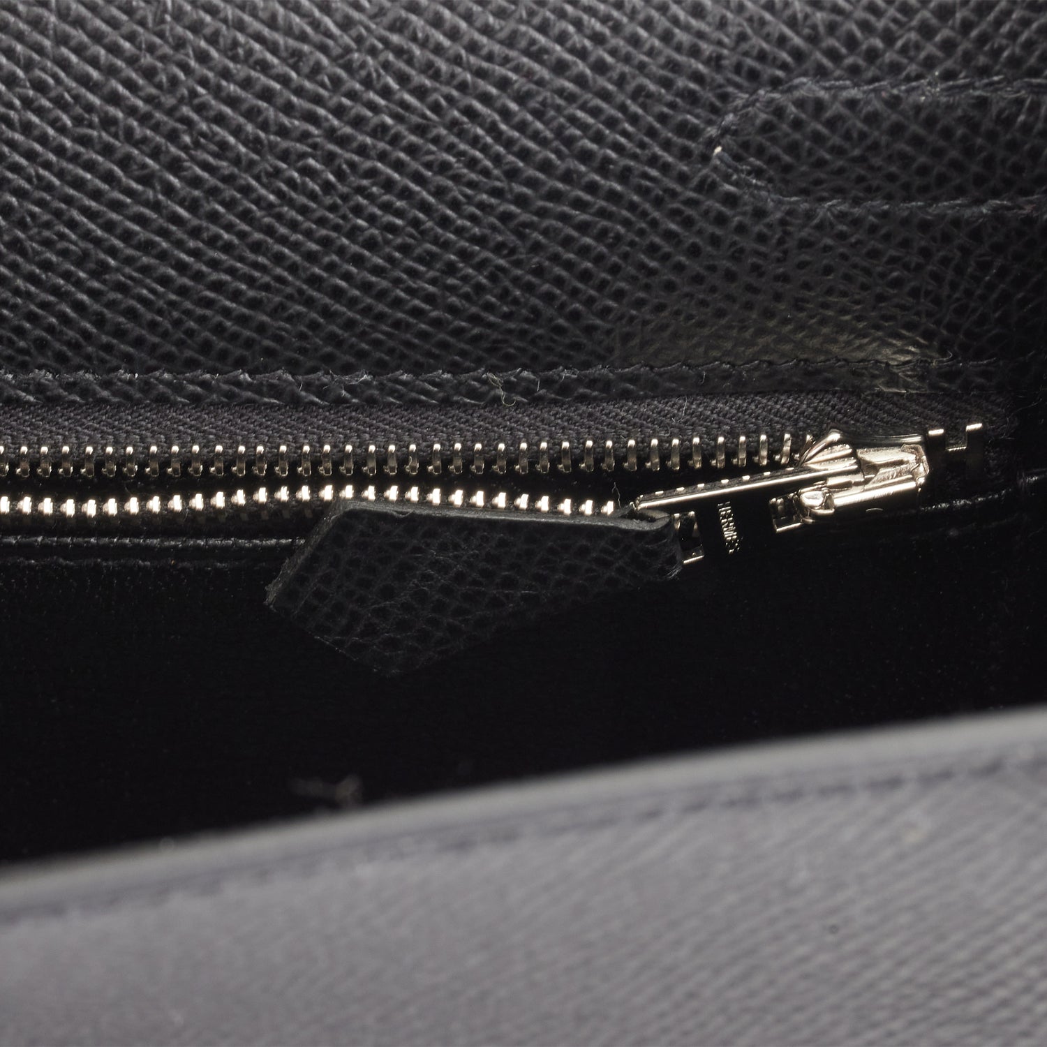 The interior is lined with black chevre leather and has one zip pocket with an Hermes engraved pull and one open pocket on the opposite side.
