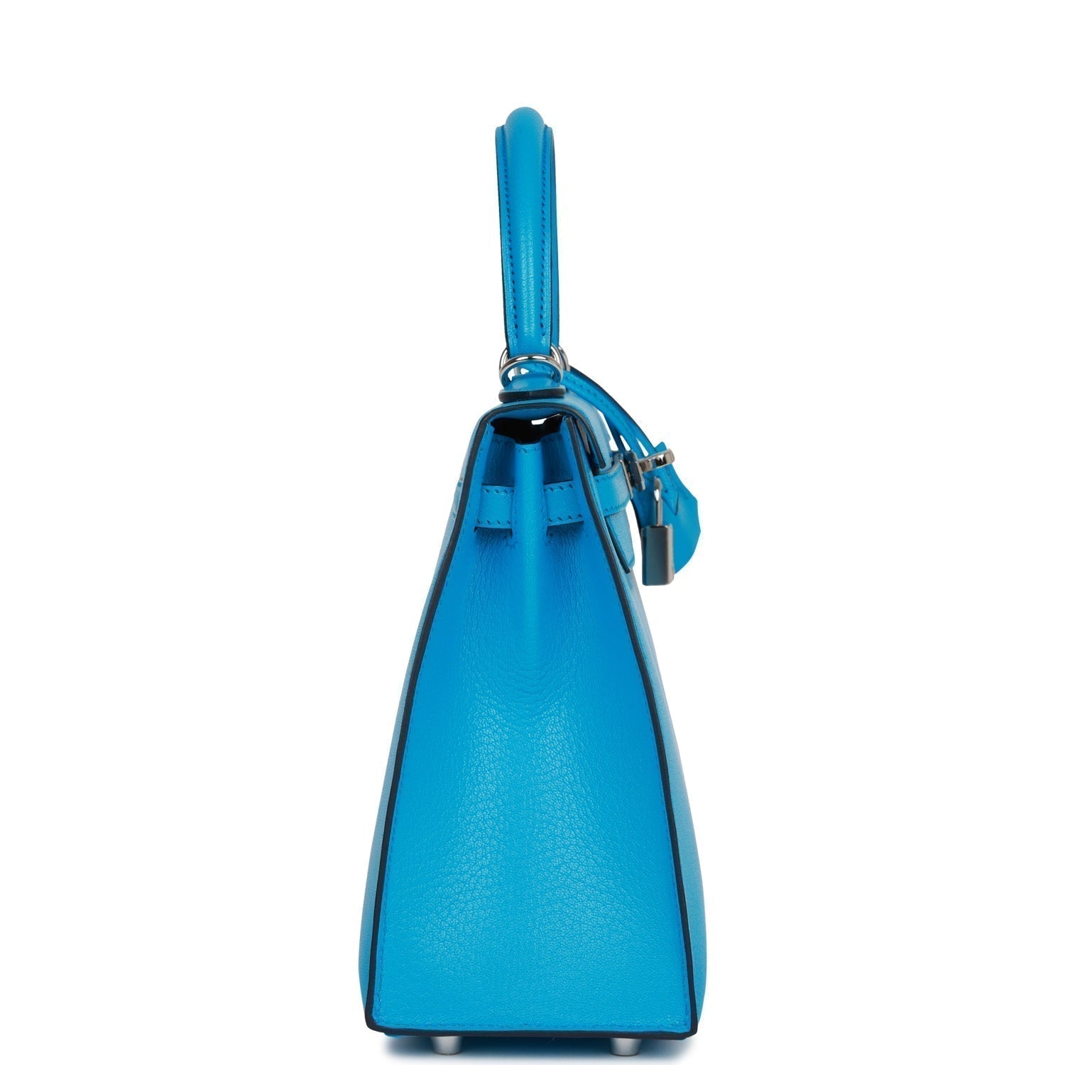 This Kelly, in the Sellier style, is in Bleu Frida chevre leather with palladium hardware and has tonal stitching, two front straps with toggle closure, clochette with lock and two keys, single rolled handle and removable shoulder strap.