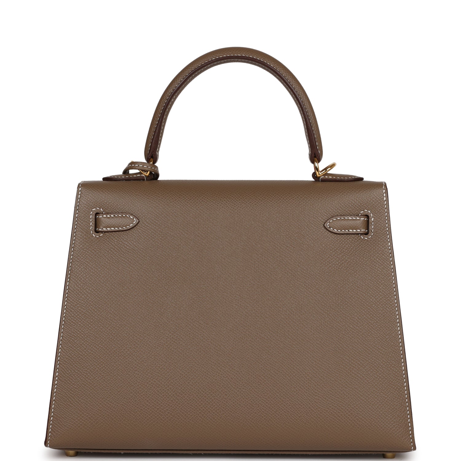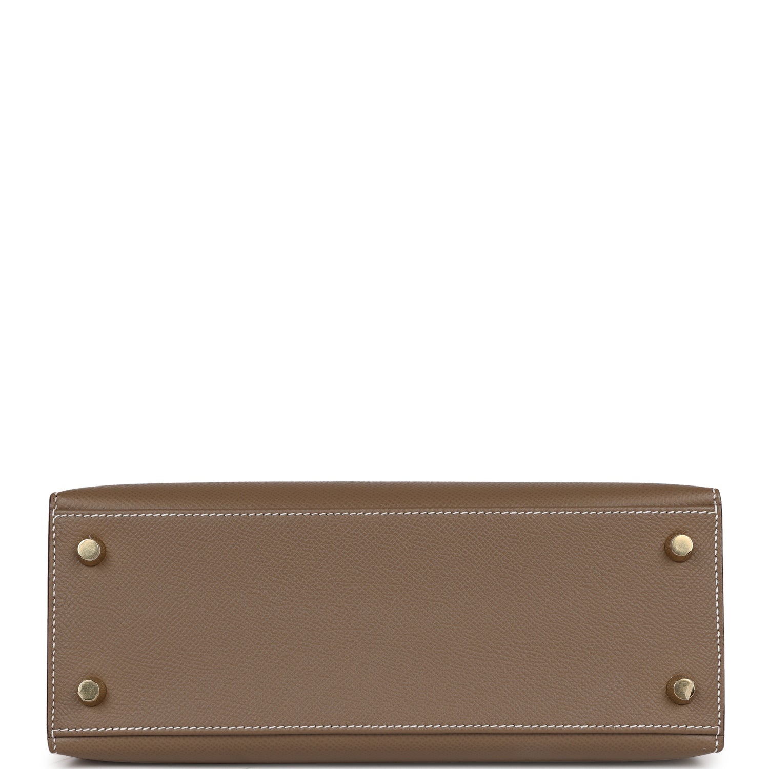This Kelly, in the Sellier style, is in Etoupe epsom leather with gold hardware, has contrast stitching, front flap, two straps with center toggle closure, clochette with lock and two keys a single rolled handle and removable shoulder strap.
