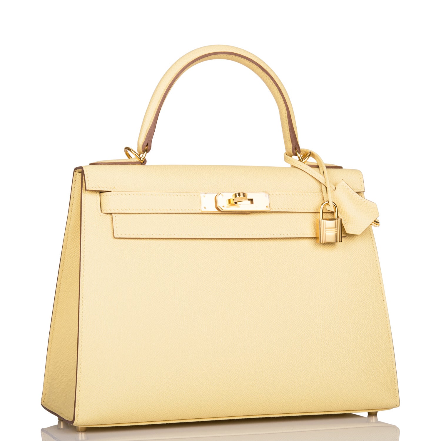 This Kelly, in the Sellier style, is in Jaune Poussin epsom leather with gold hardware and has tonal stitching, front flap, two straps with center toggle closure, clochette with lock and two keys, single rolled handle and removable shoulder strap.