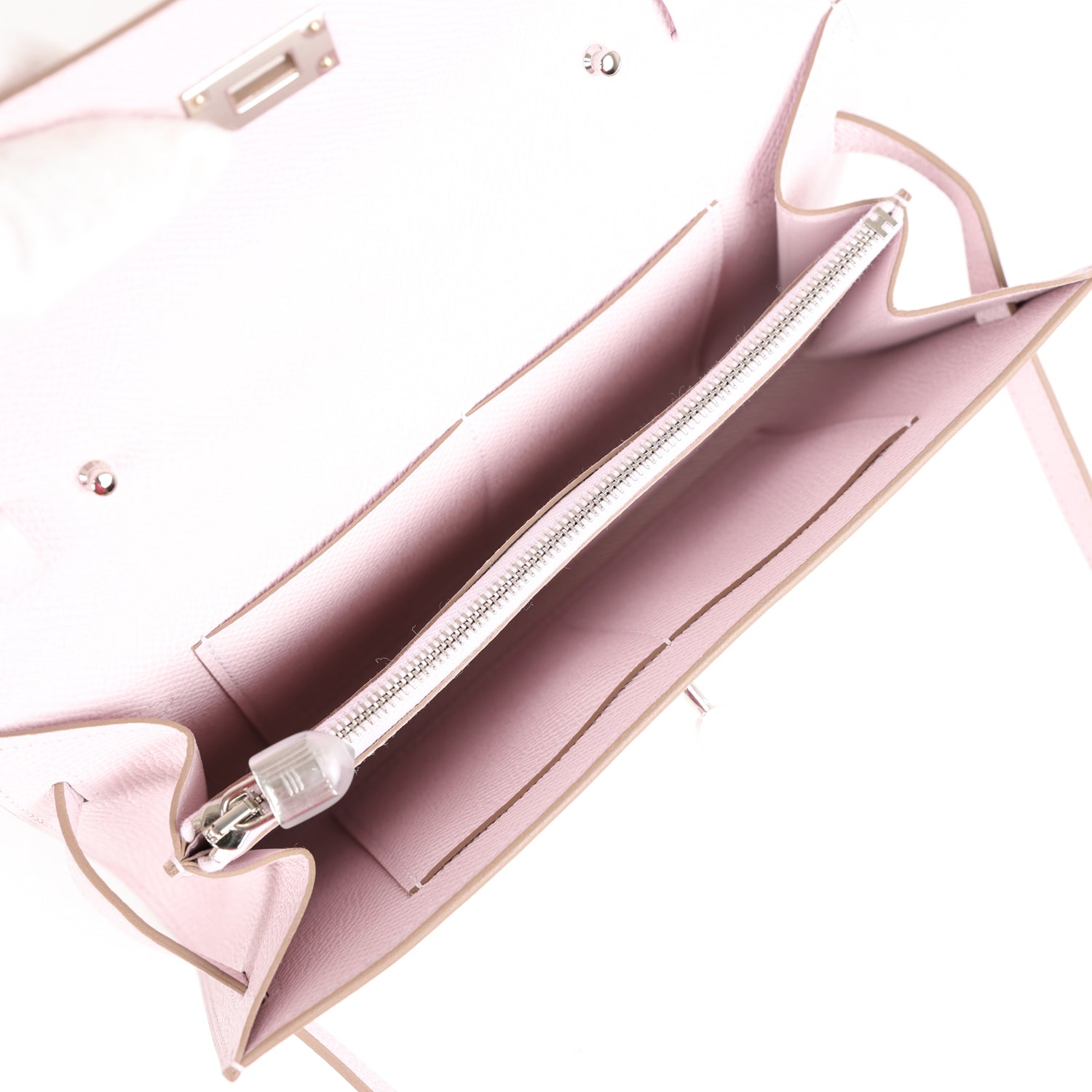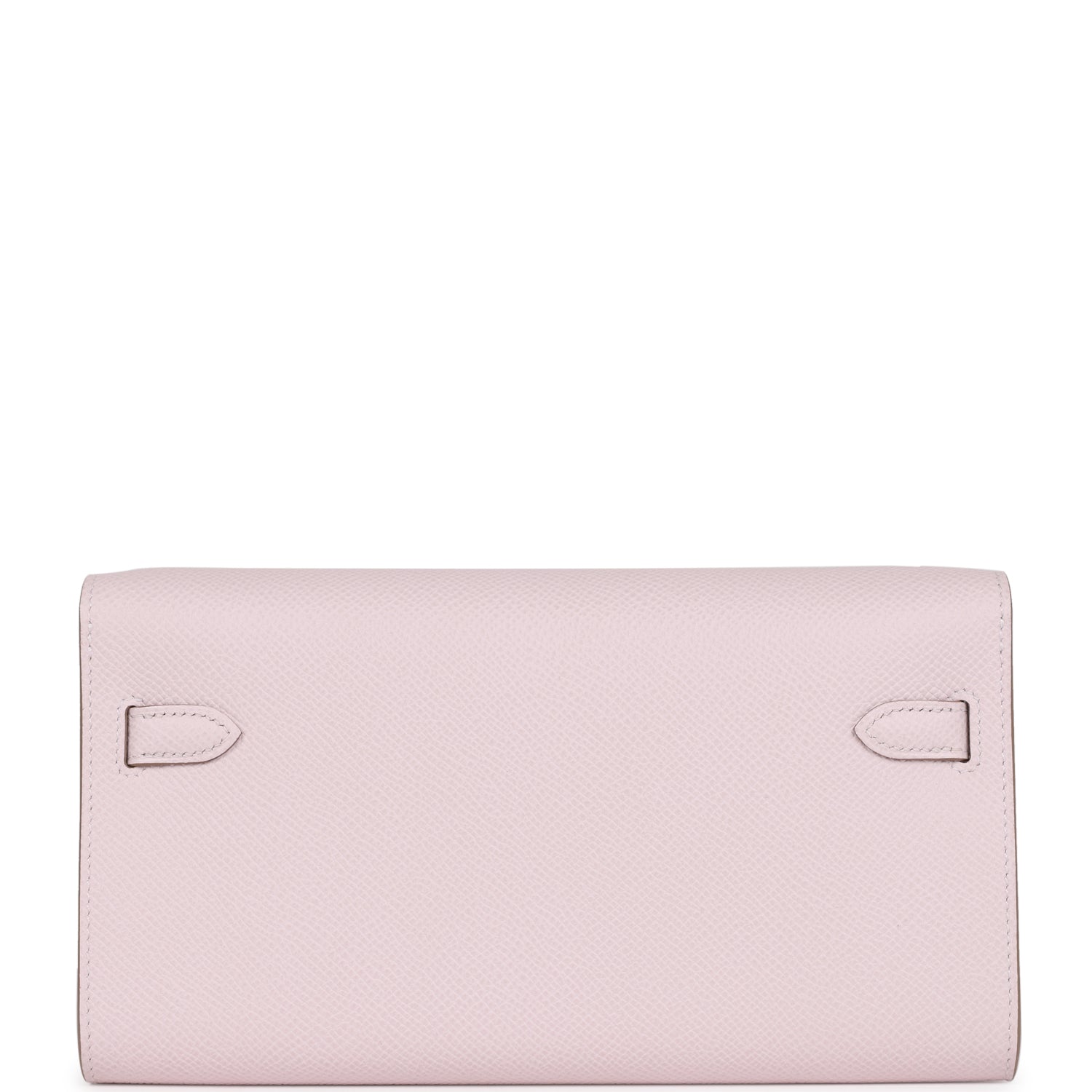 This Kelly Wallet To Go is in Mauve Pale epsom leather with palladium hardware and has tonal stitching, two straps with front toggle closure and removable crossbody strap.