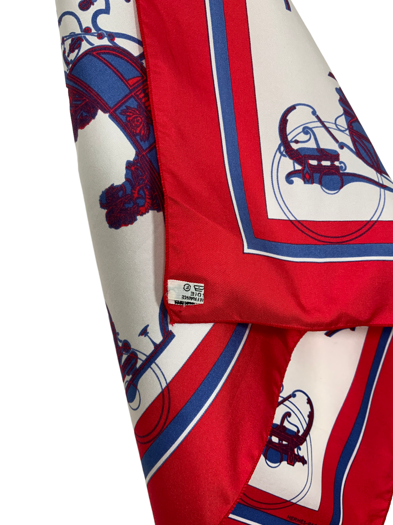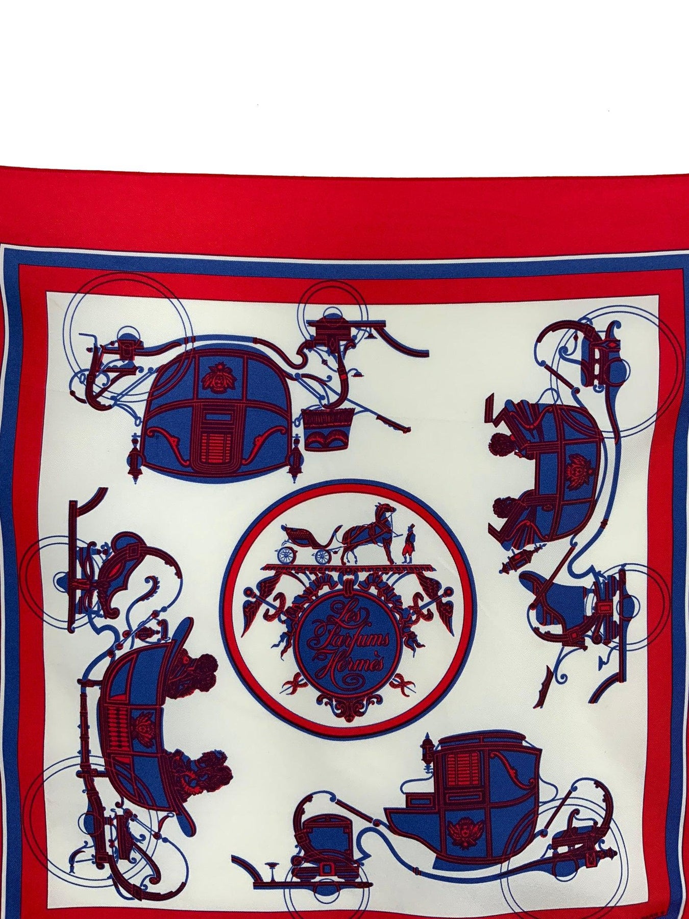 We the ity of this gorgeous Hermes les Parfums Silk Pocket Square which features beautiful hues of red, white and blue with stunning images of horse carriages.