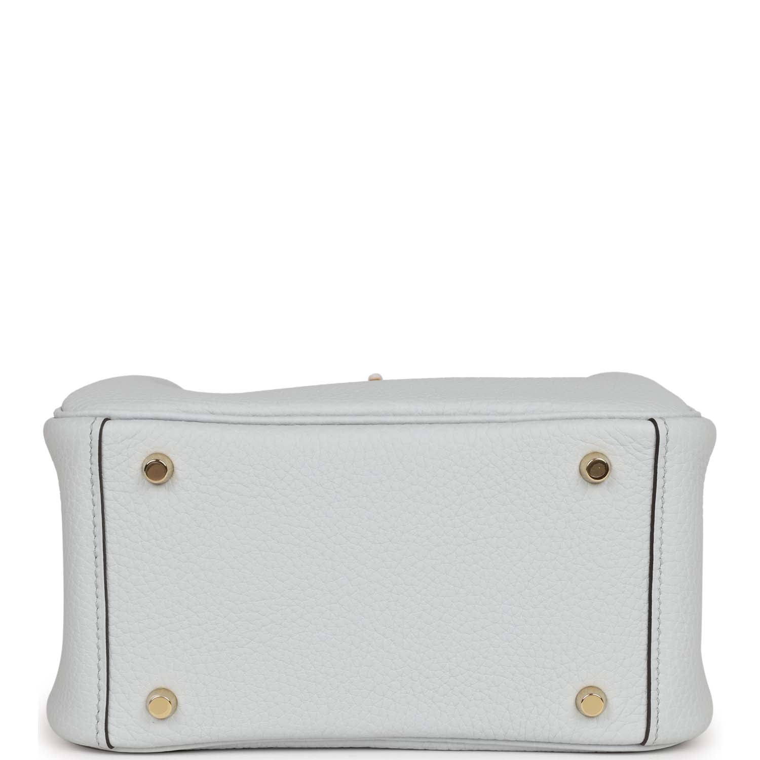 This Mini Lindy is in Bleu Pale clemence leather with gold hardware and has tonal stitching, double zipper pulls, front Hermès twist lock, single pocket on each side, two rolled top handles linked by a flat shoulder strap.