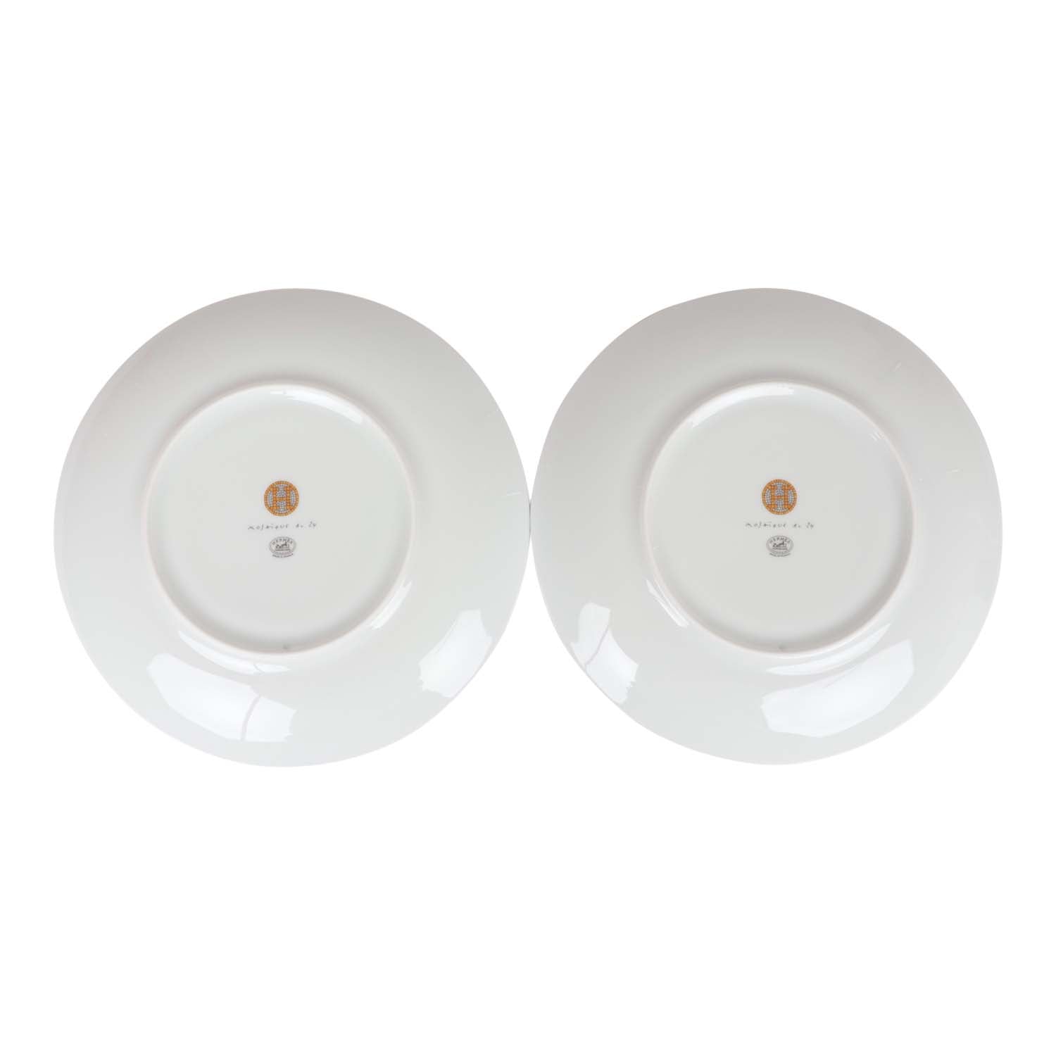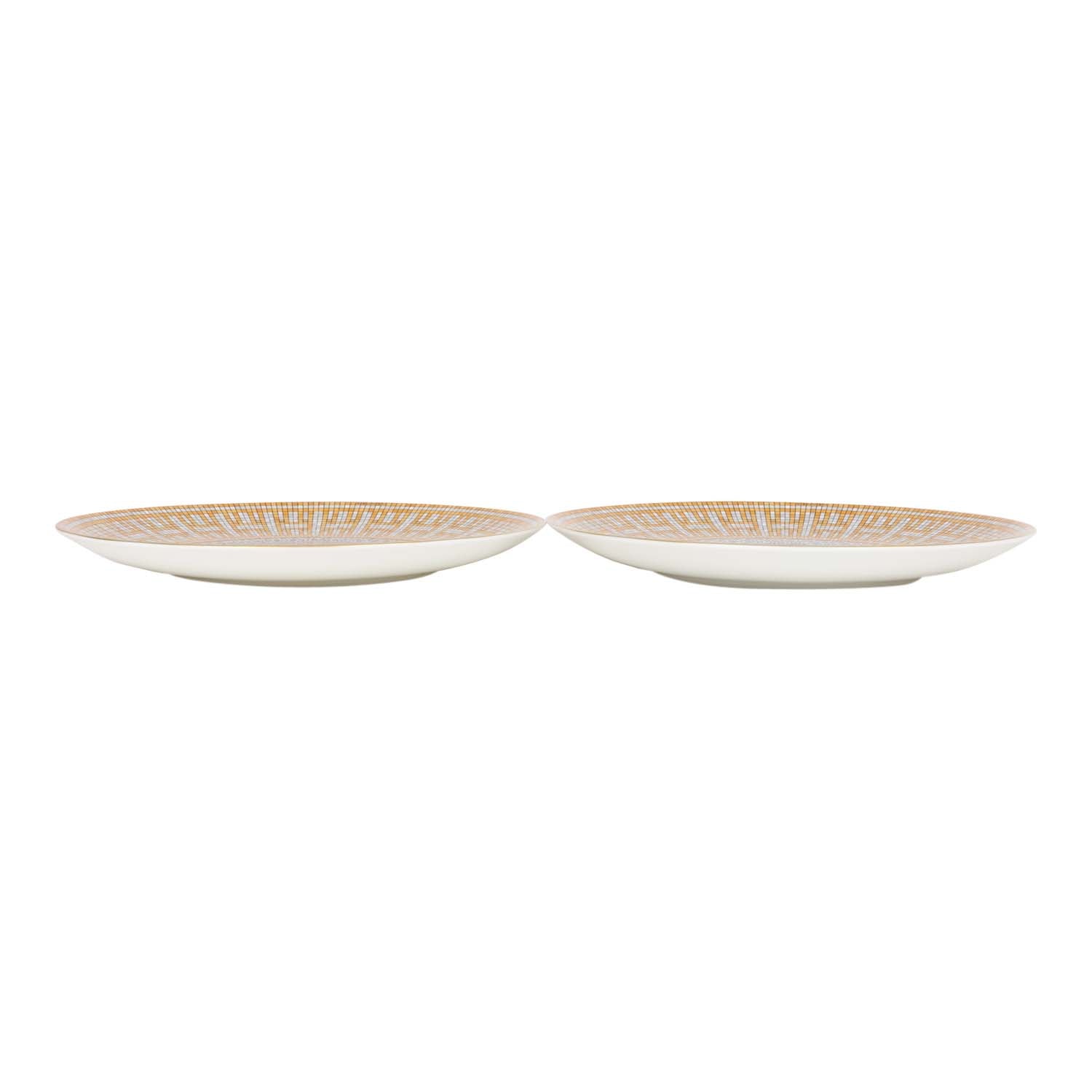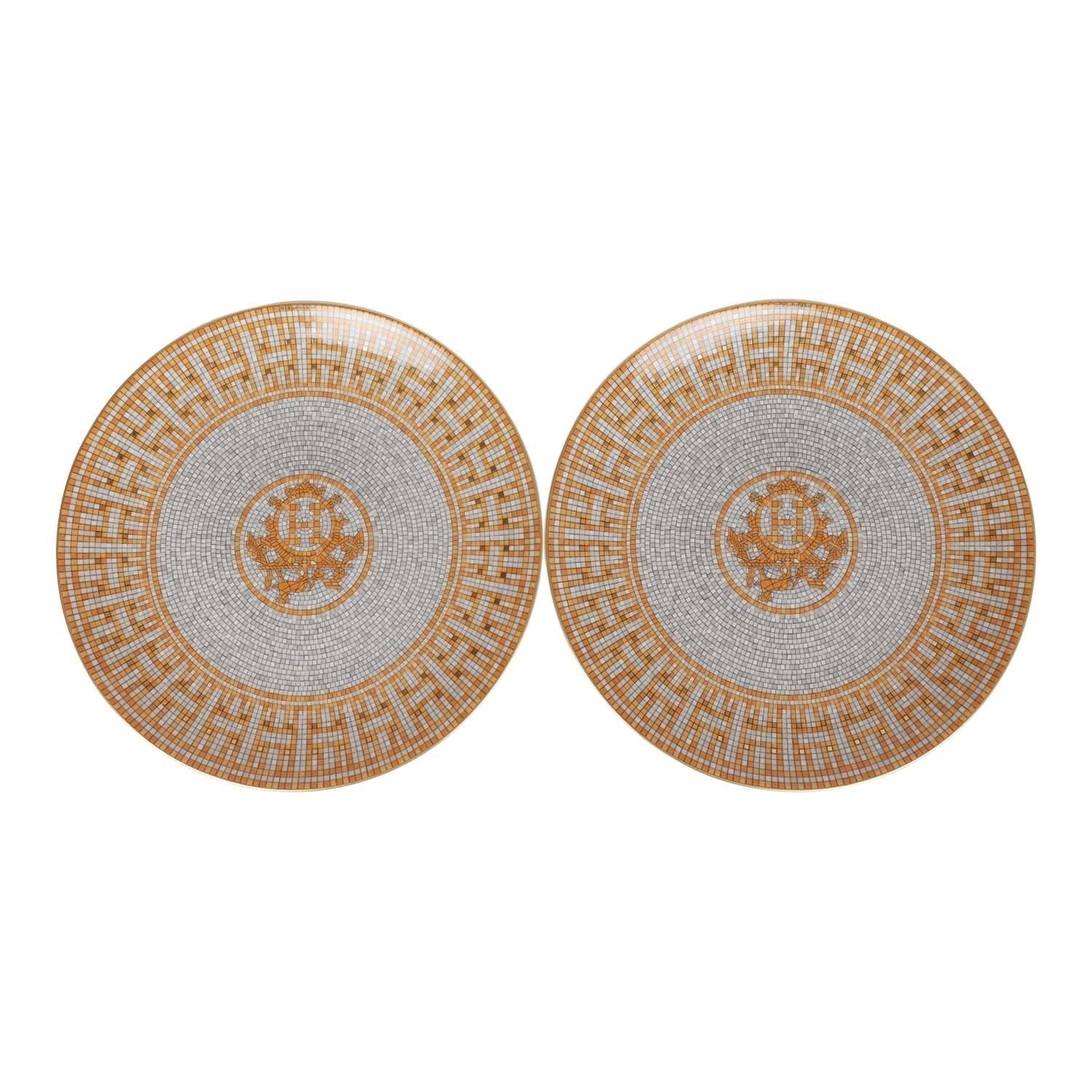 Hermes "Mosaique Au 24" dessert plate set in gold and grey porcelain.