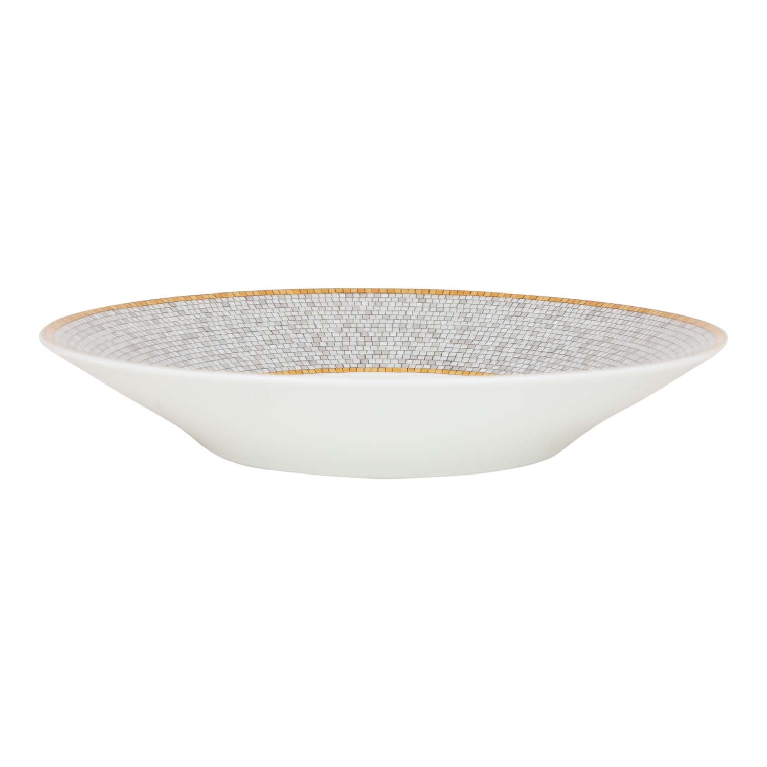 This "Mosaique Au 24" tea cup and saucer set is in gold and grey porcelain.