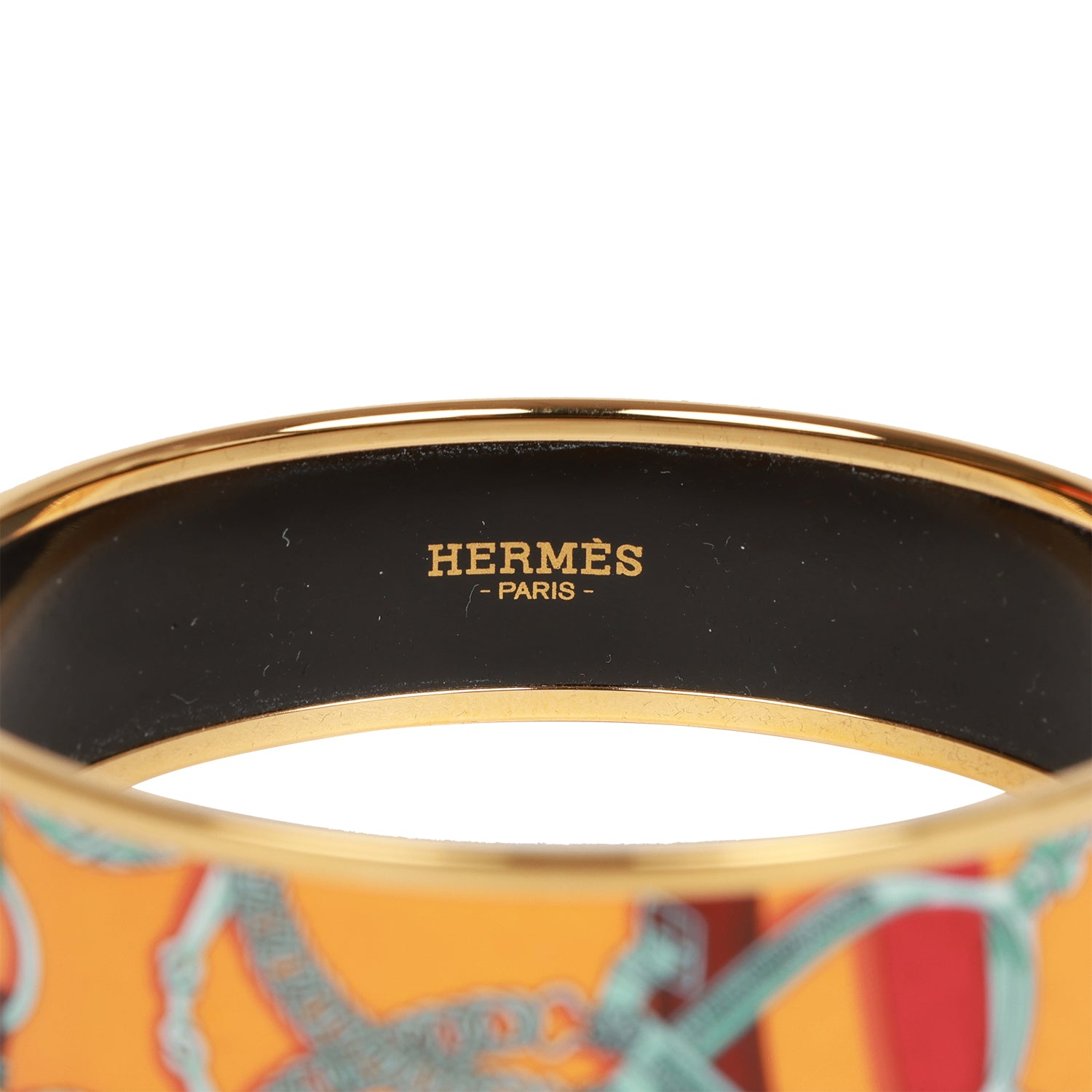 This bracelet is in printed enamel with gold plated hardware.