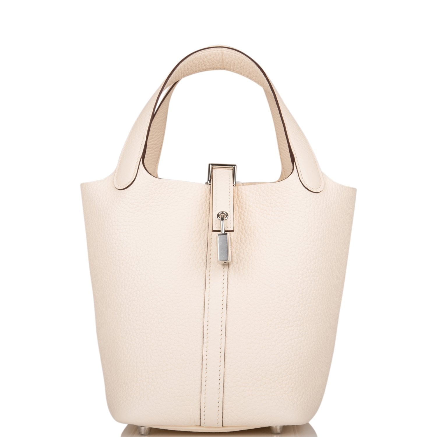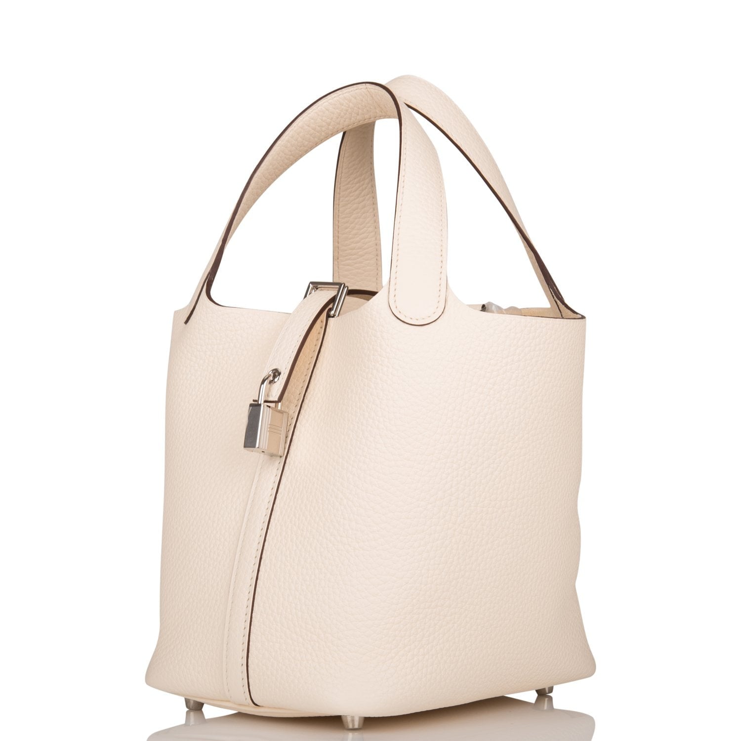 This Picotin Lock is in Nata clemence leather with palladium hardware and has tonal stitching with two top handles.