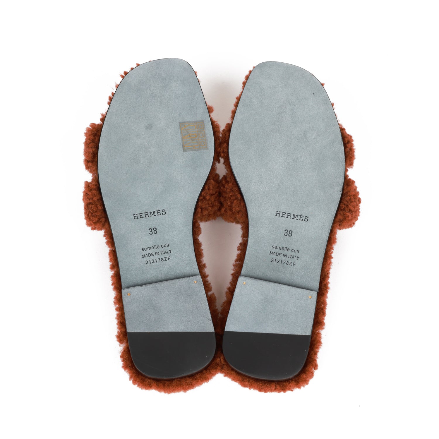 This pair of Oran Sandals are in cognac woolskin and feature the iconic H crossover strap.