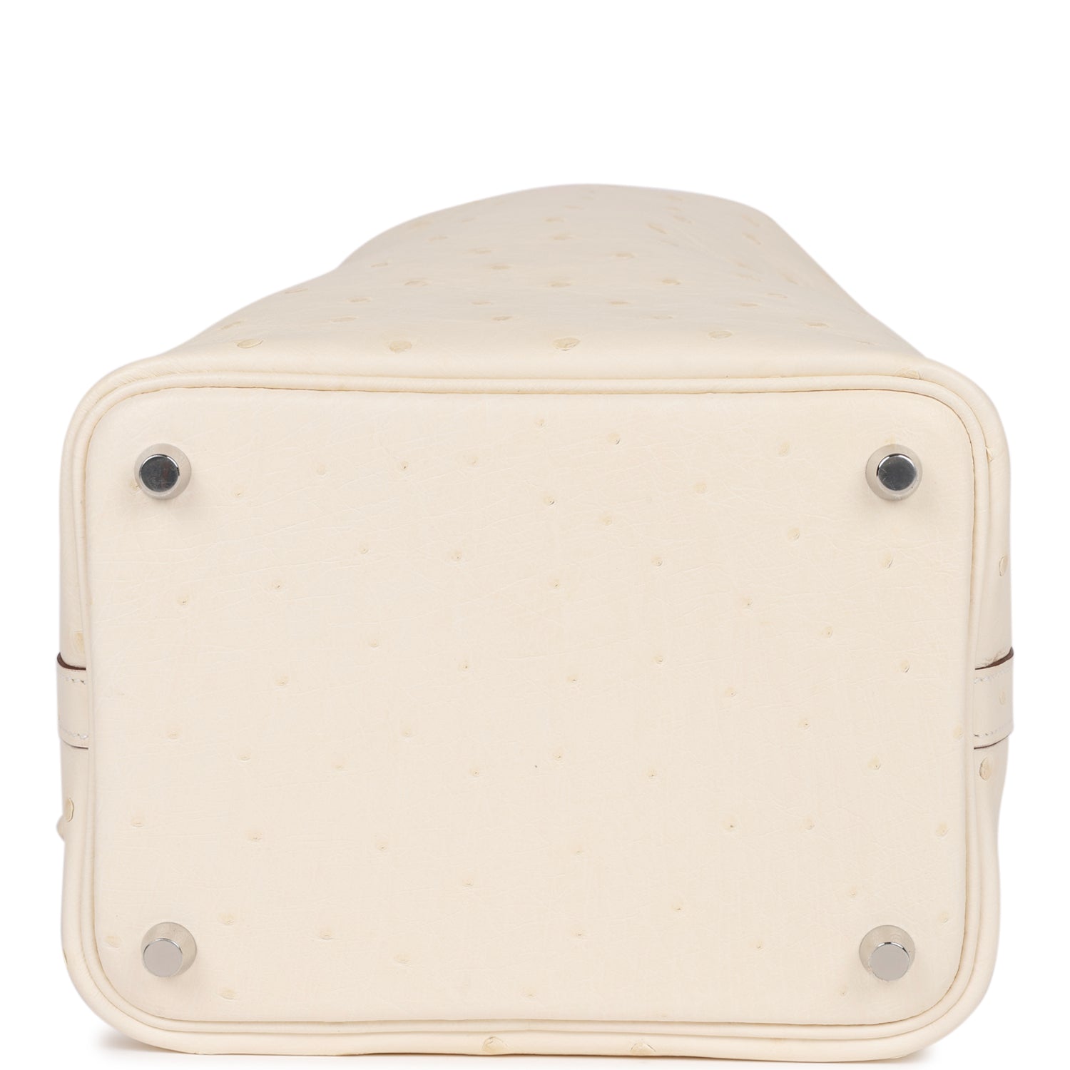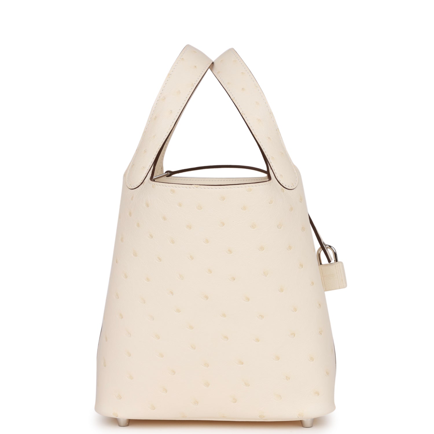This Picotin Lock is in Nata ostrich with palladium hardware and has tonal stitching with two top handles.