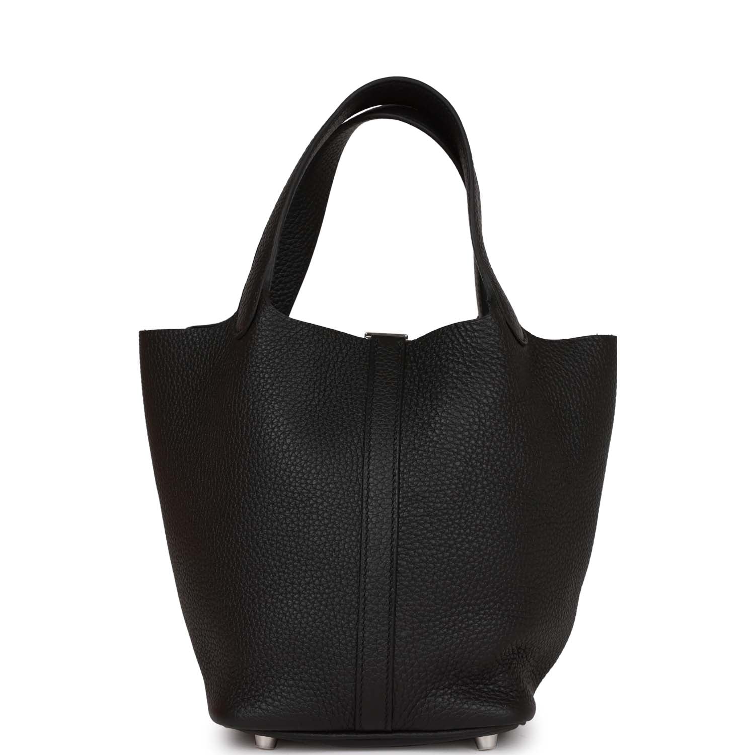 This Picotin Lock is in Black clemence leather with palladium hardware and has tonal stitching with two top handles.