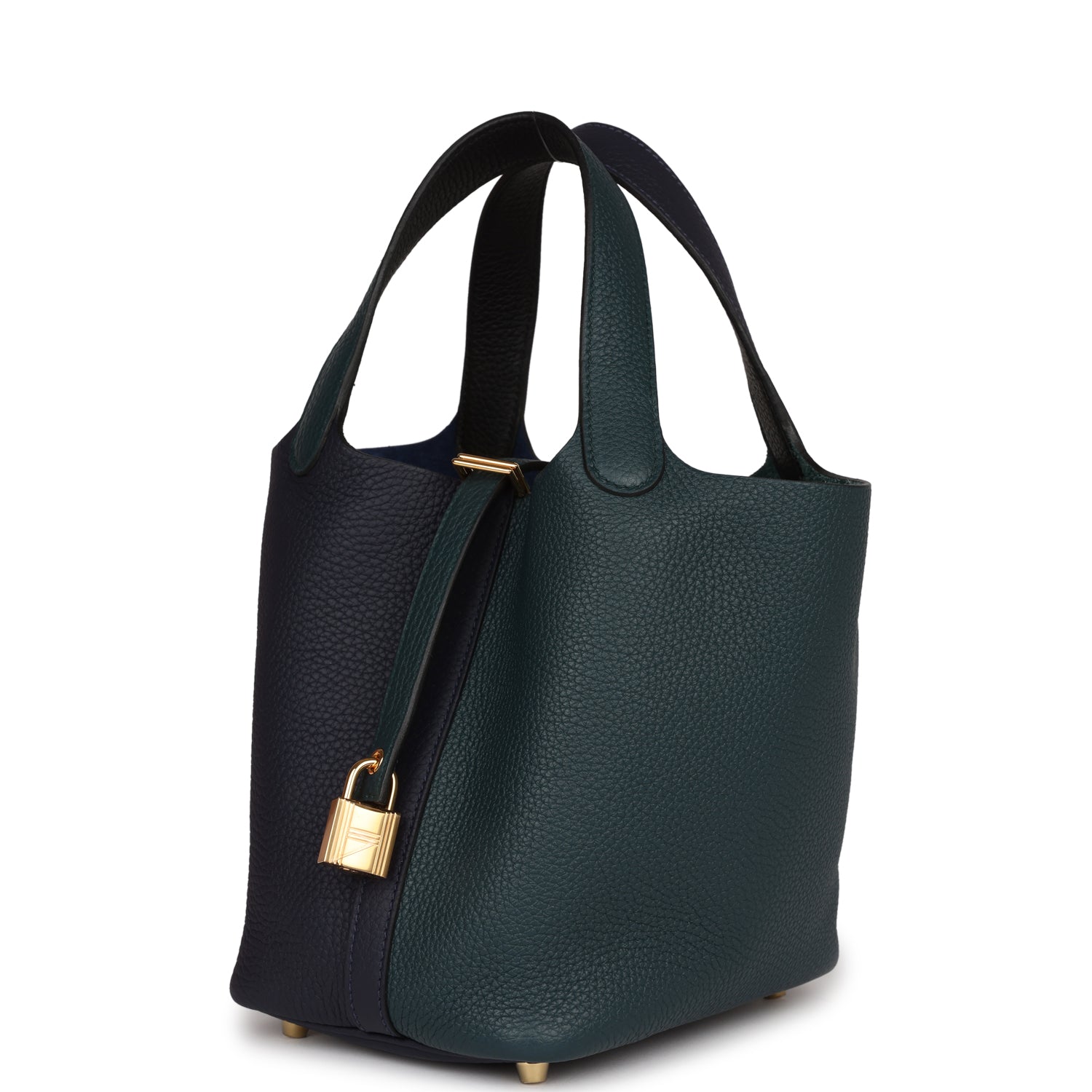 This Picotin Lock is in Bleu Nuit clemence leather with gold hardware and has tonal stitching with two top handles.