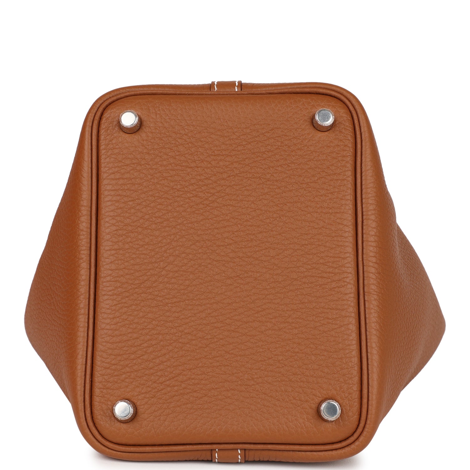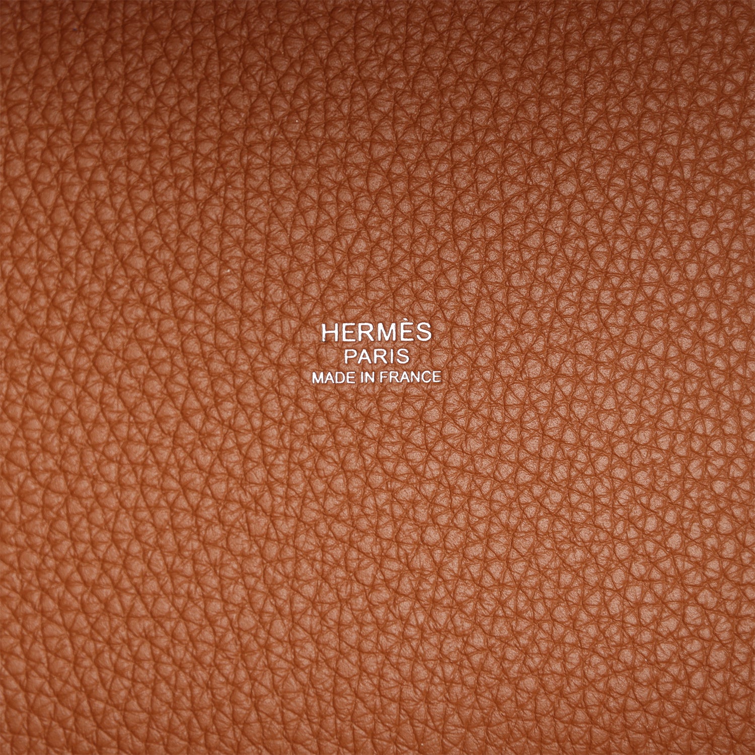 This Picotin Lock is in Gold clemence leather with palladium hardware and has contrast stitching with two top handles.