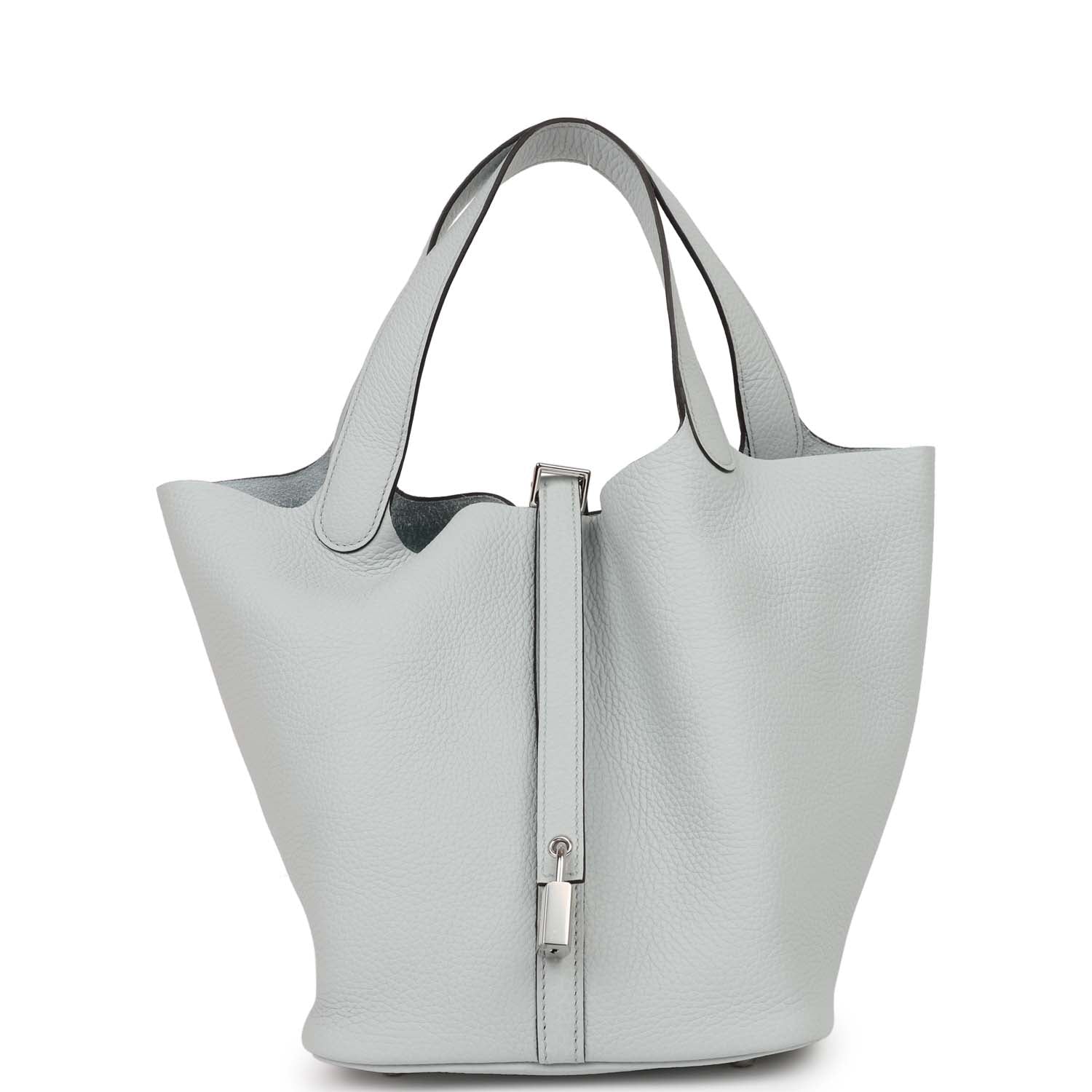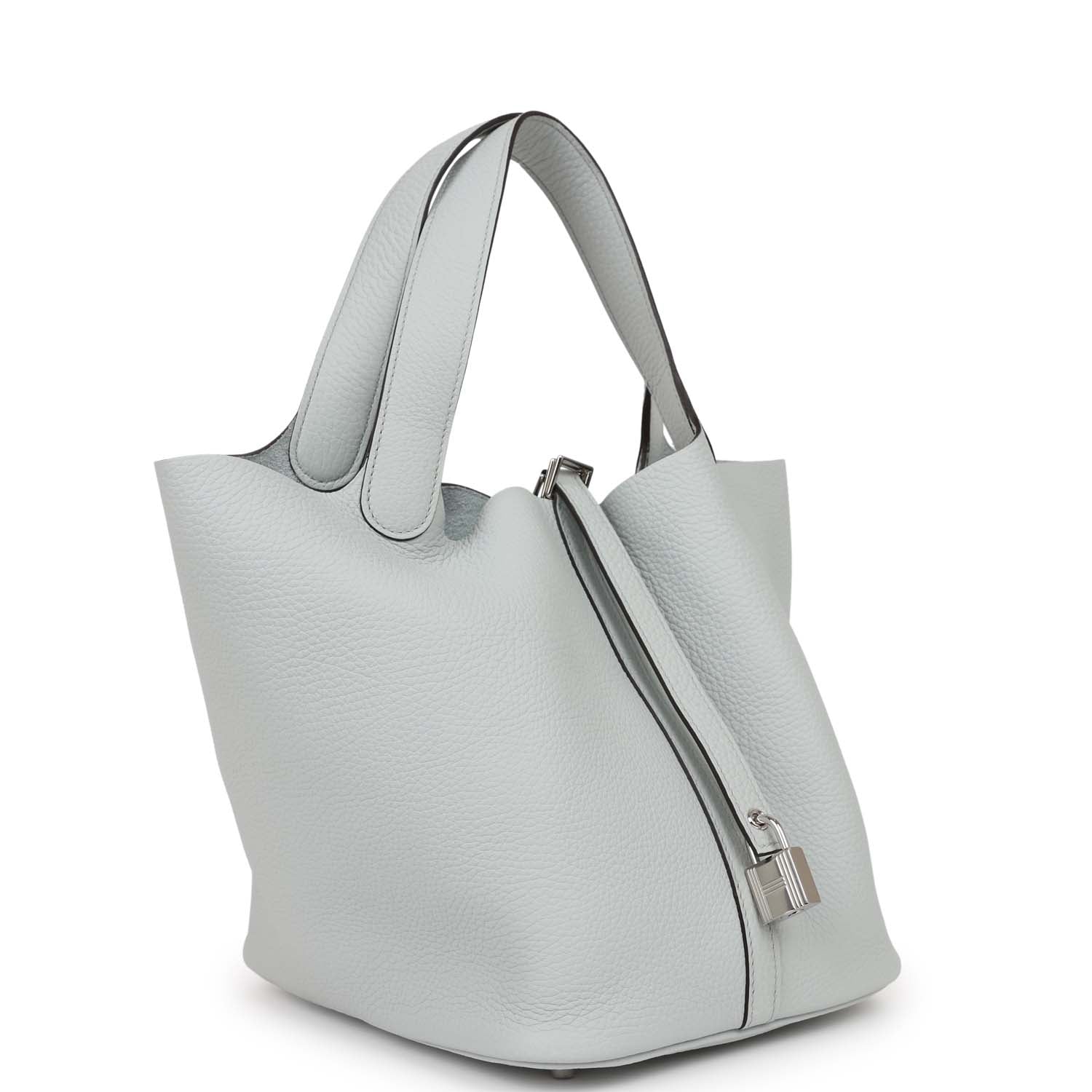 This Picotin is in Bleu Pale clemence leather with palladium hardware and has tonal stitching with two top handles.