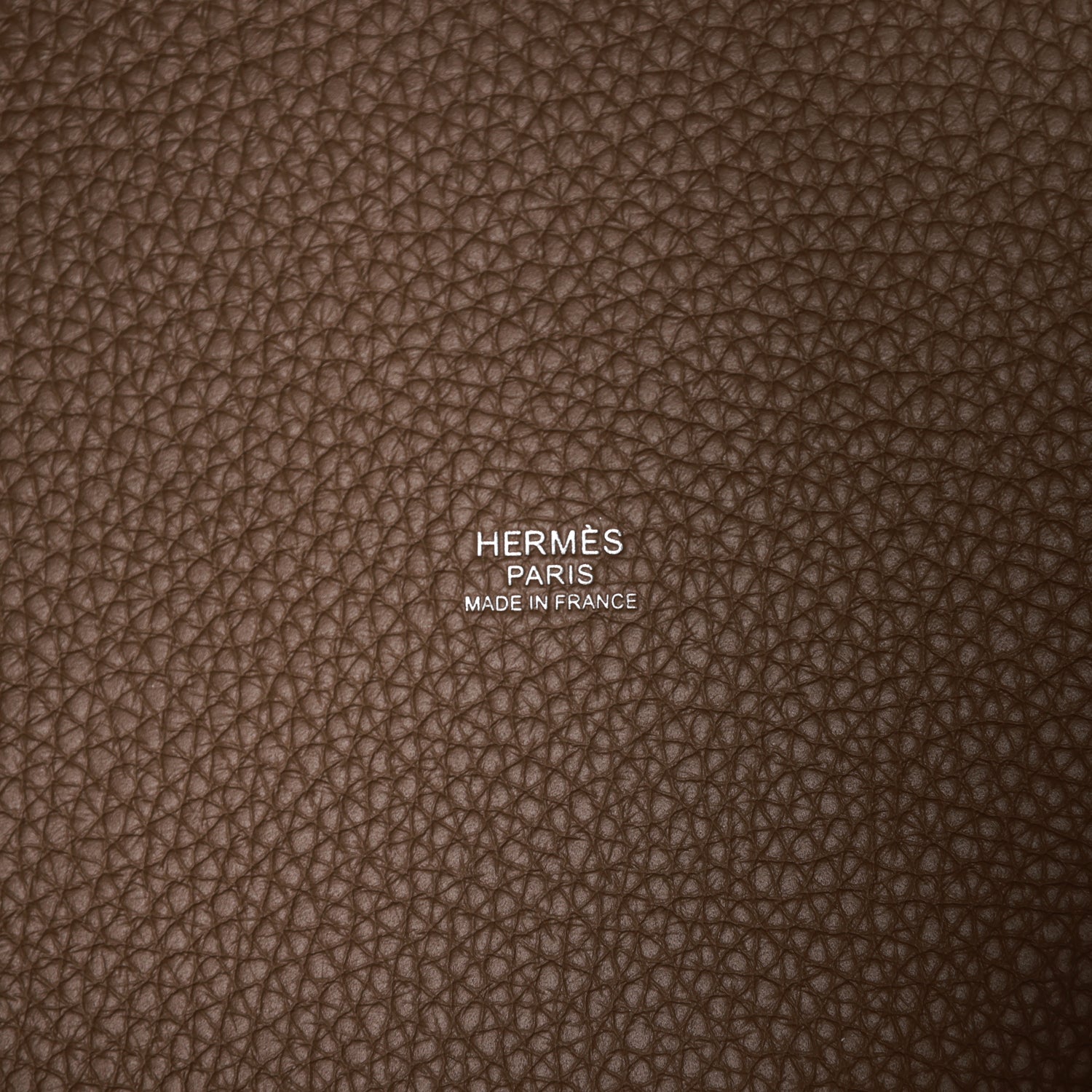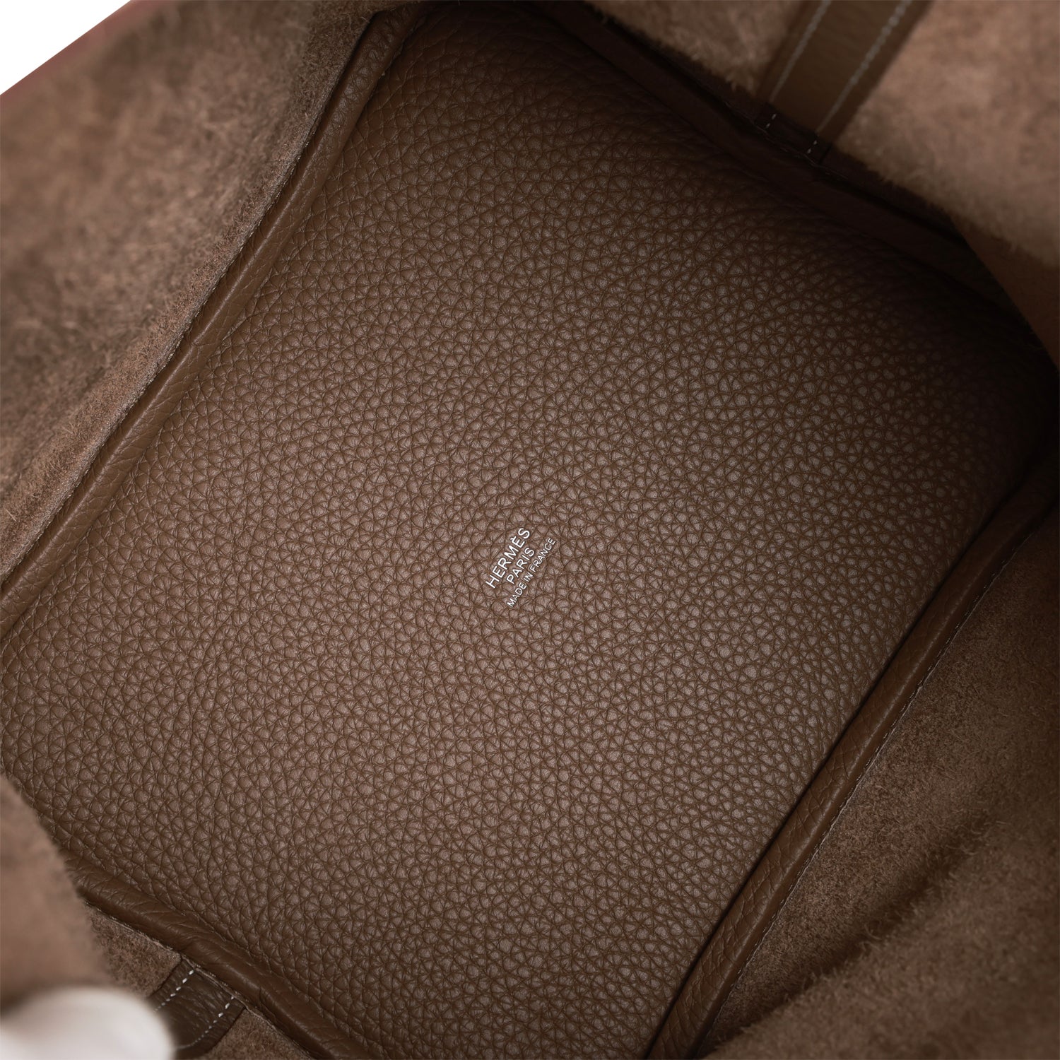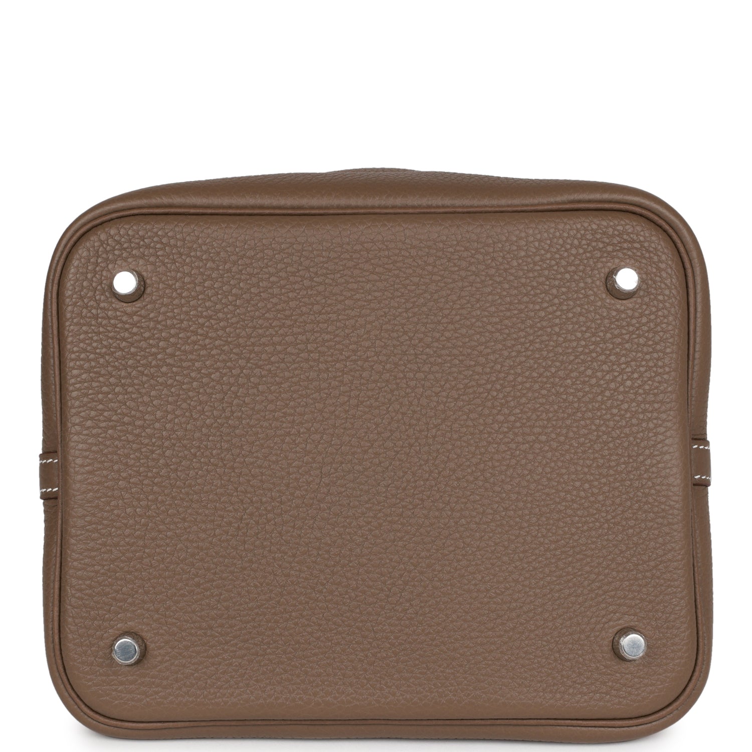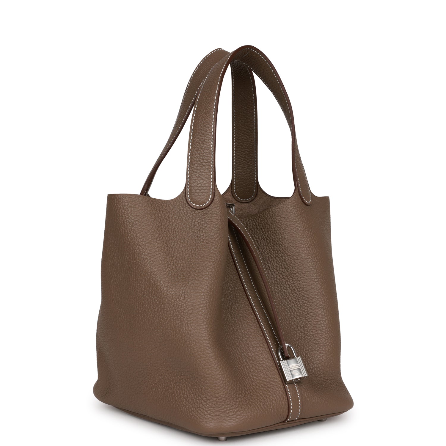 This Picotin is in Etoupe clemence leather with palladium hardware and has white contrast stitching with two top handles.