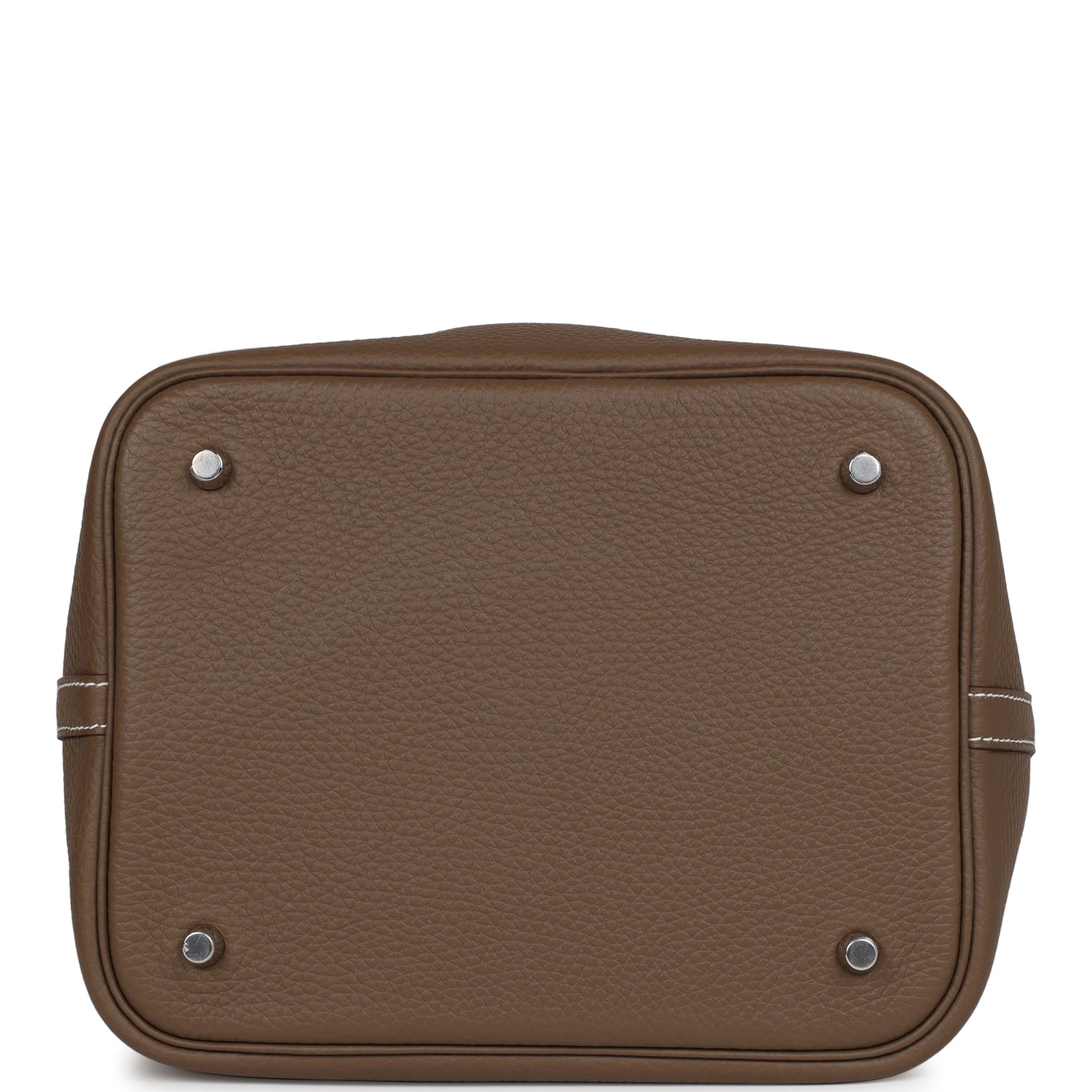 This Picotin is in Etoupe clemence leather with palladium hardware and has white contrast stitching with two top handles.