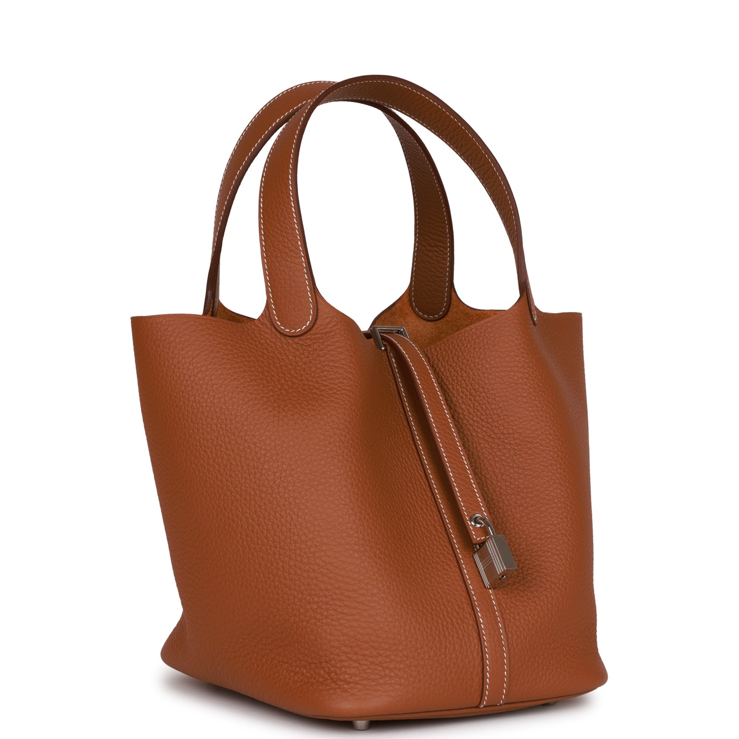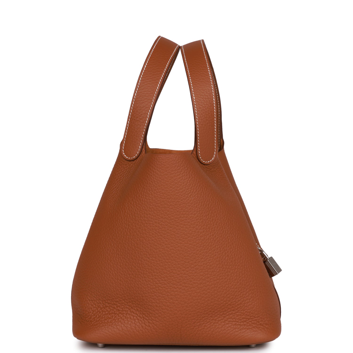 This Picotin is in Gold clemence leather with palladium hardware and has contrast stitching with two top handles.