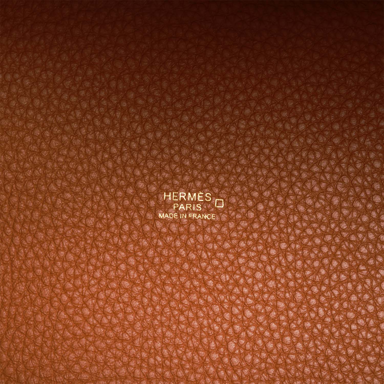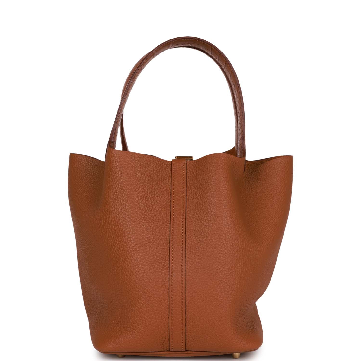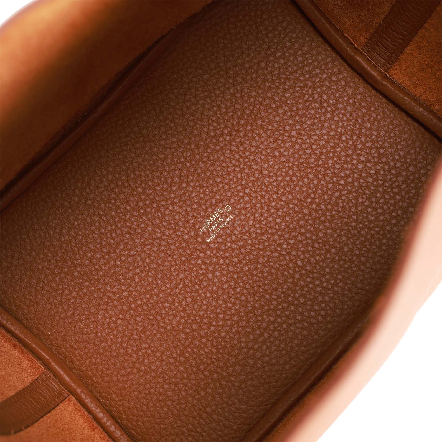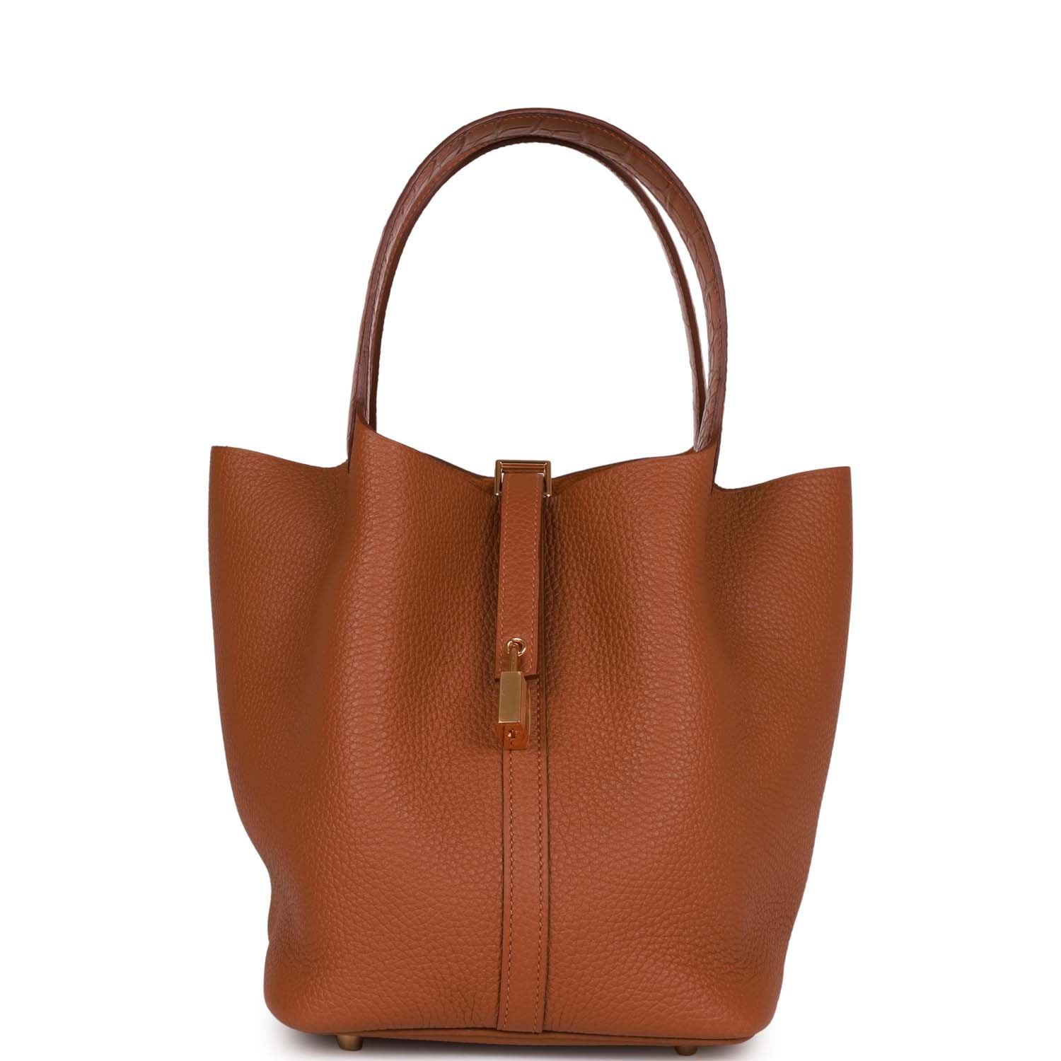 This Picotin Lock is in gold matte alligator and clemence leather with gold hardware and has tonal stitching with two top handles.