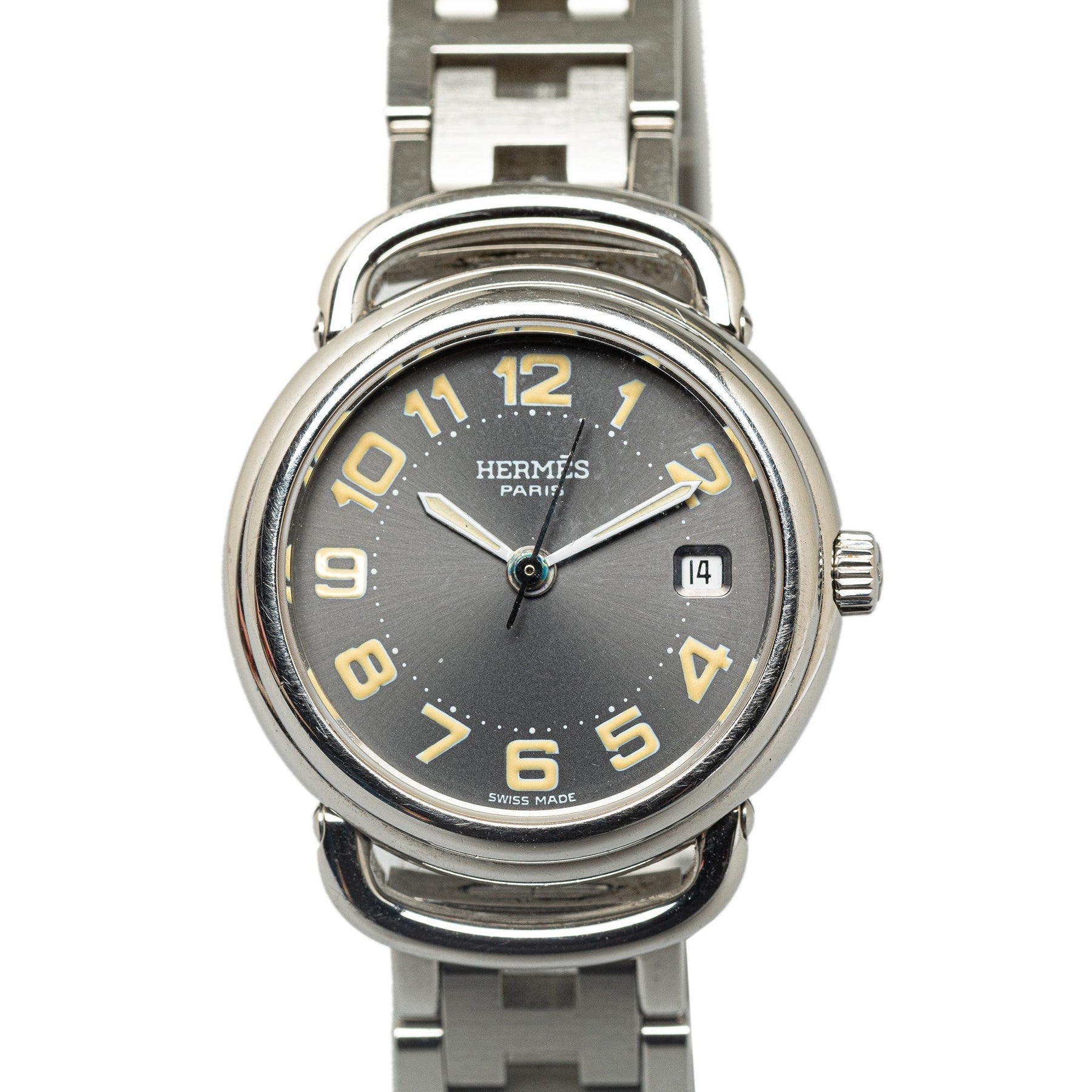 This watch features a stainless steel case and strap, a quartz movement, and a date display.