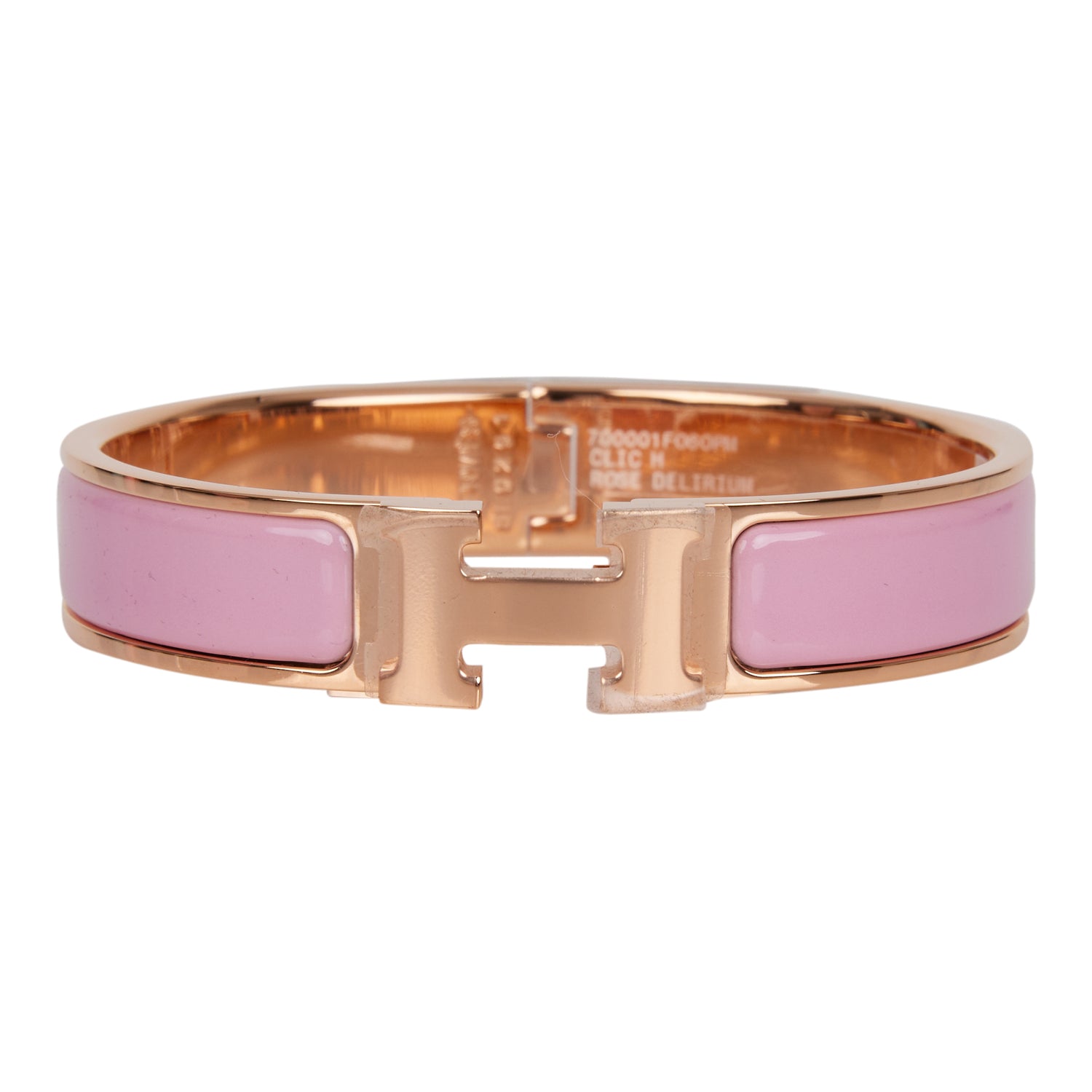 Hermes narrow Clic Clac H bracelet in Rose Delirium enamel with rose gold plated hardware in size PM.