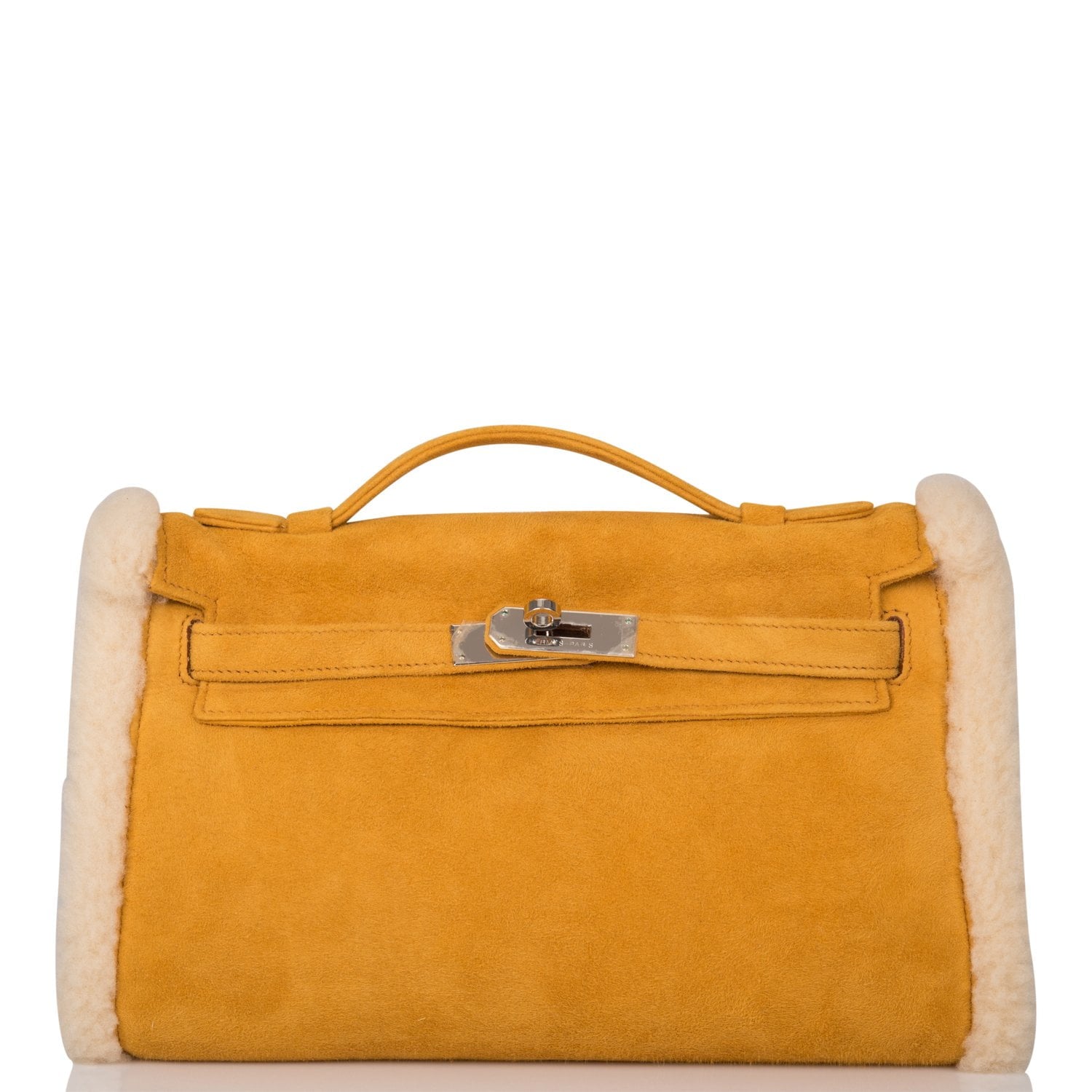 This Kelly Muff is in Sable doblis and shearling with palladium hardware and has tonal stitching, two straps with front toggle closure and a top flat handle and open sides to use as a hand warmer.