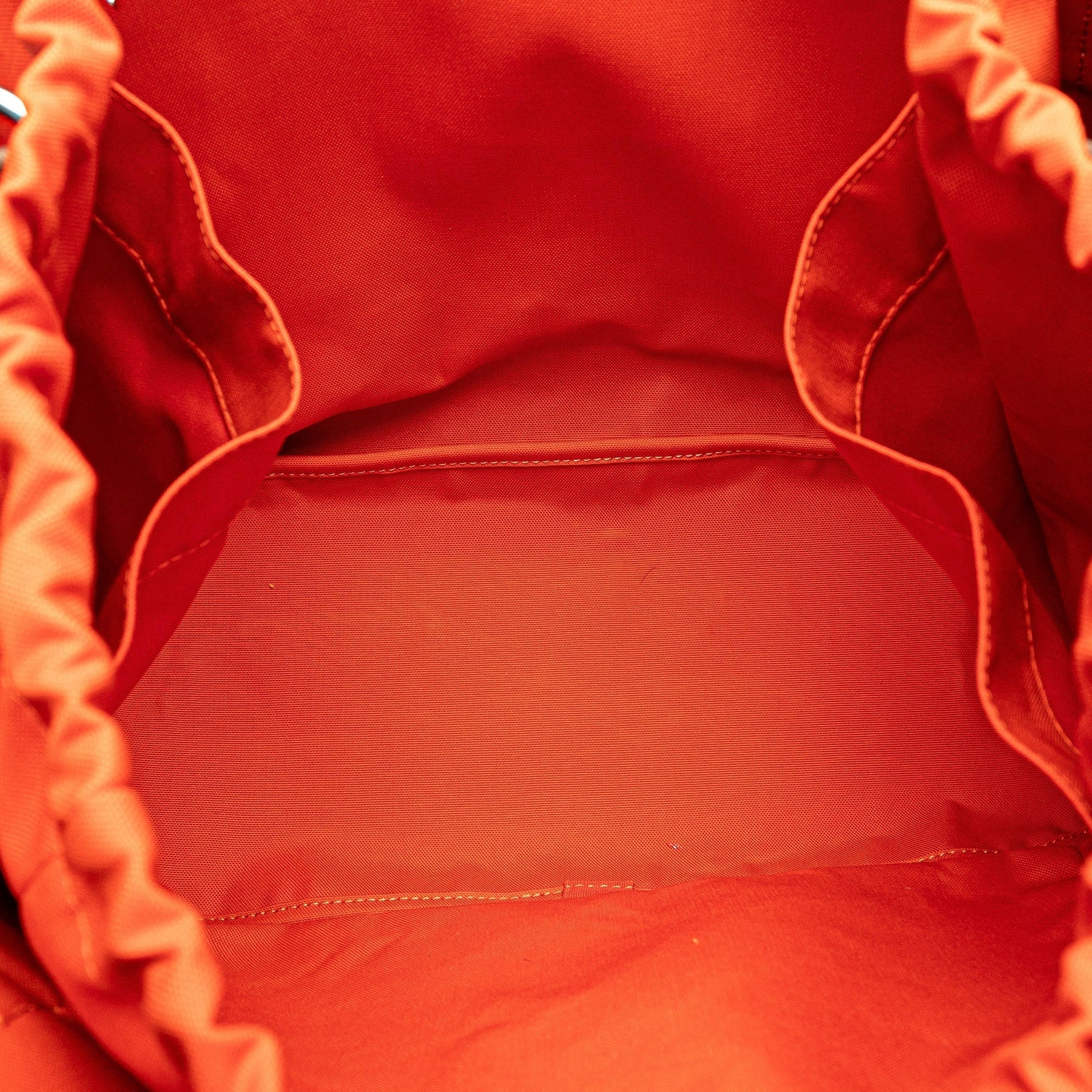 This satchel features a canvas body, flat canvas handles, a detachable flat canvas strap, an open top with drawstring closure, exterior slip pockets, and interior zip and slip pockets. Comes with box and dust bag.