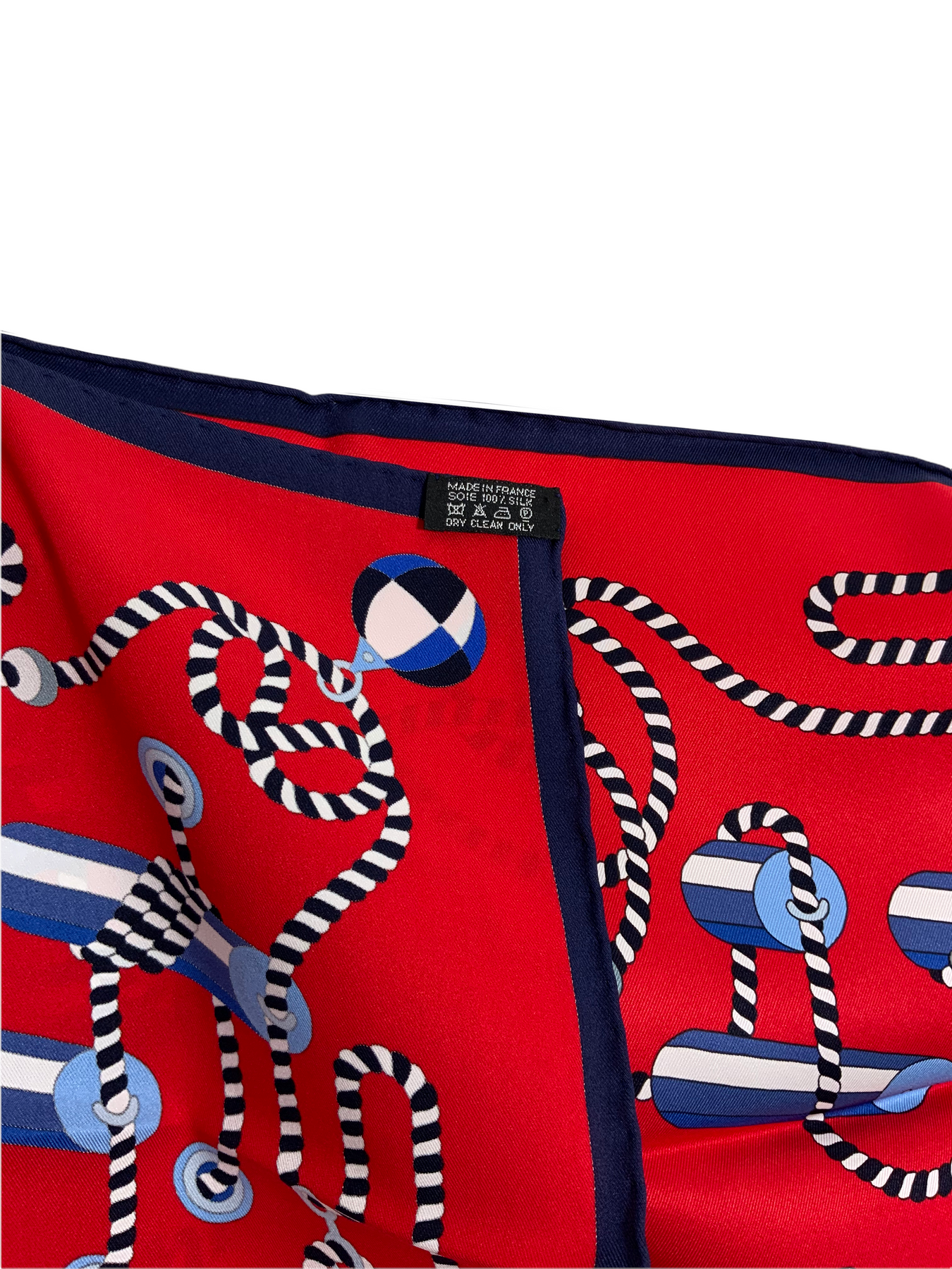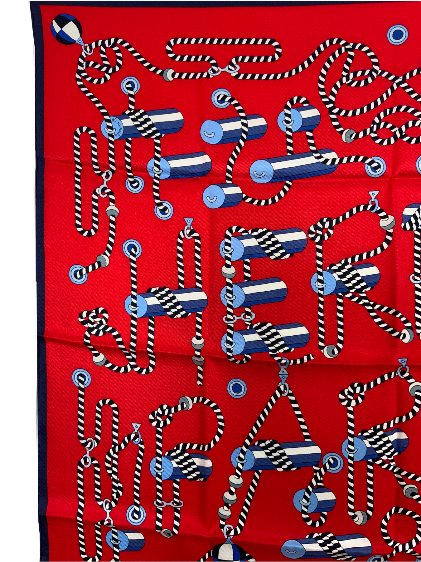 We the ity of this chic Hermes Silk Cordages Scarf 70 designed by Pierre Marie and first designed in 1970 and reissued in 2013. It features aquatic ropes and cords on a stunning bright red silk background and navy blue hand rolled edges.