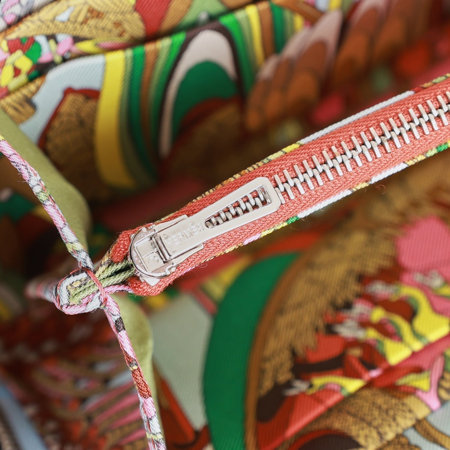 The interior is lined with multicolor silk and has 12 credit card slots with a middle zip compartment.