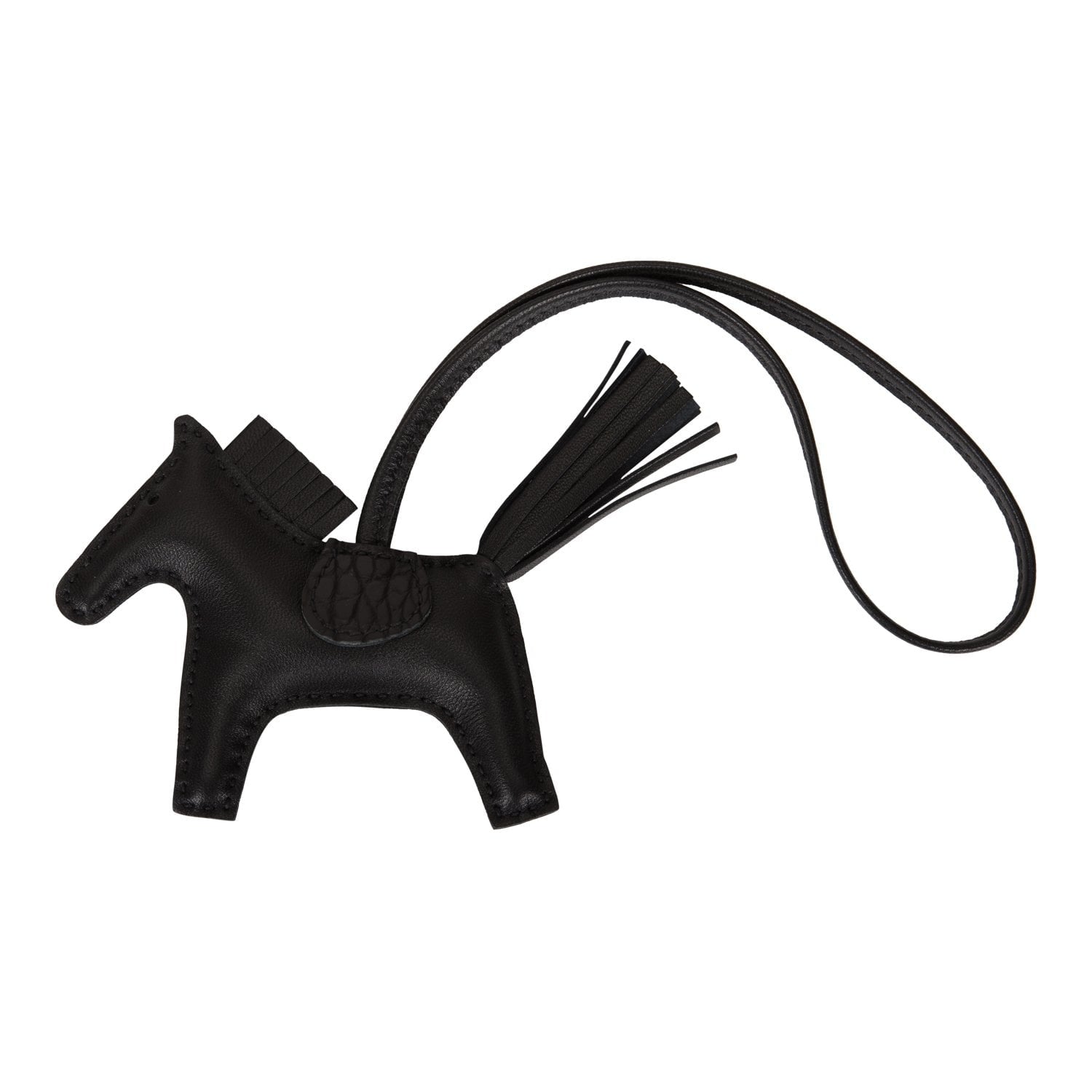 This charm is made of Black Milo lambskin leather with a matching mane, matte alligator saddle, tail and holder.
