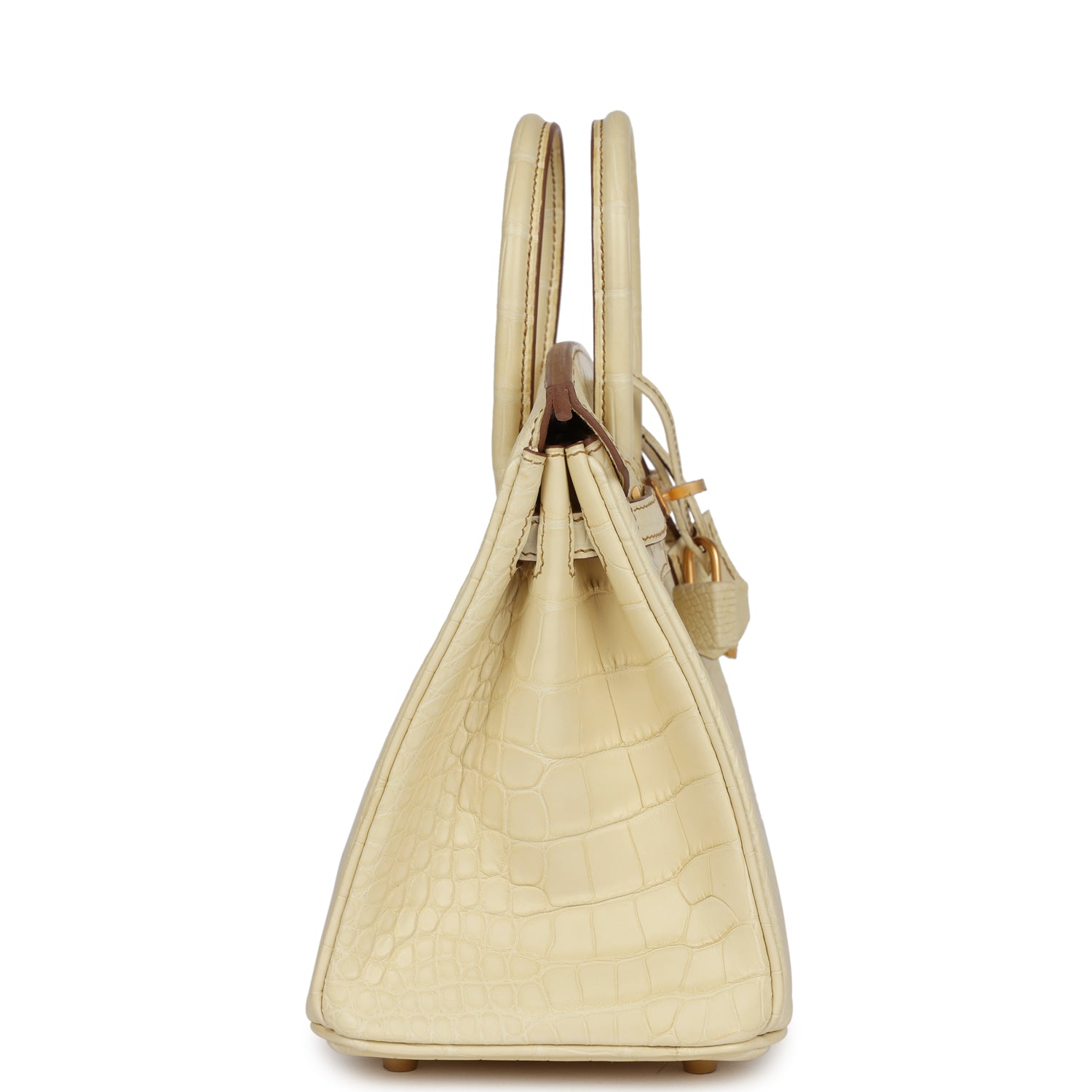 This Special Order Birkin, is in Vanille (Vanilla) matte Mississippiensis alligator with brushed gold hardware and has contrast stitching, front strap, two straps with center toggle closure, clochette with lock and two keys and double rolled handles.